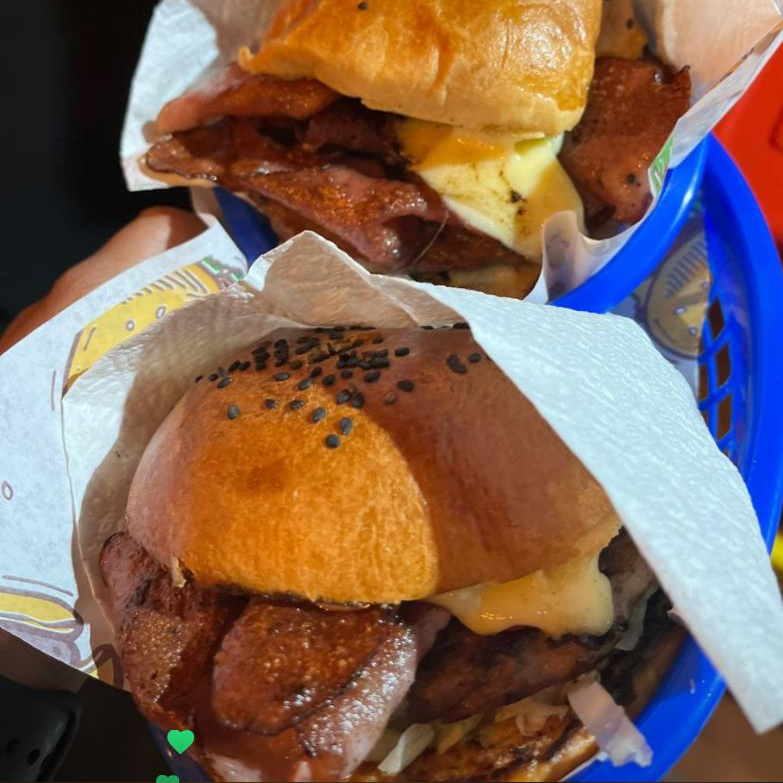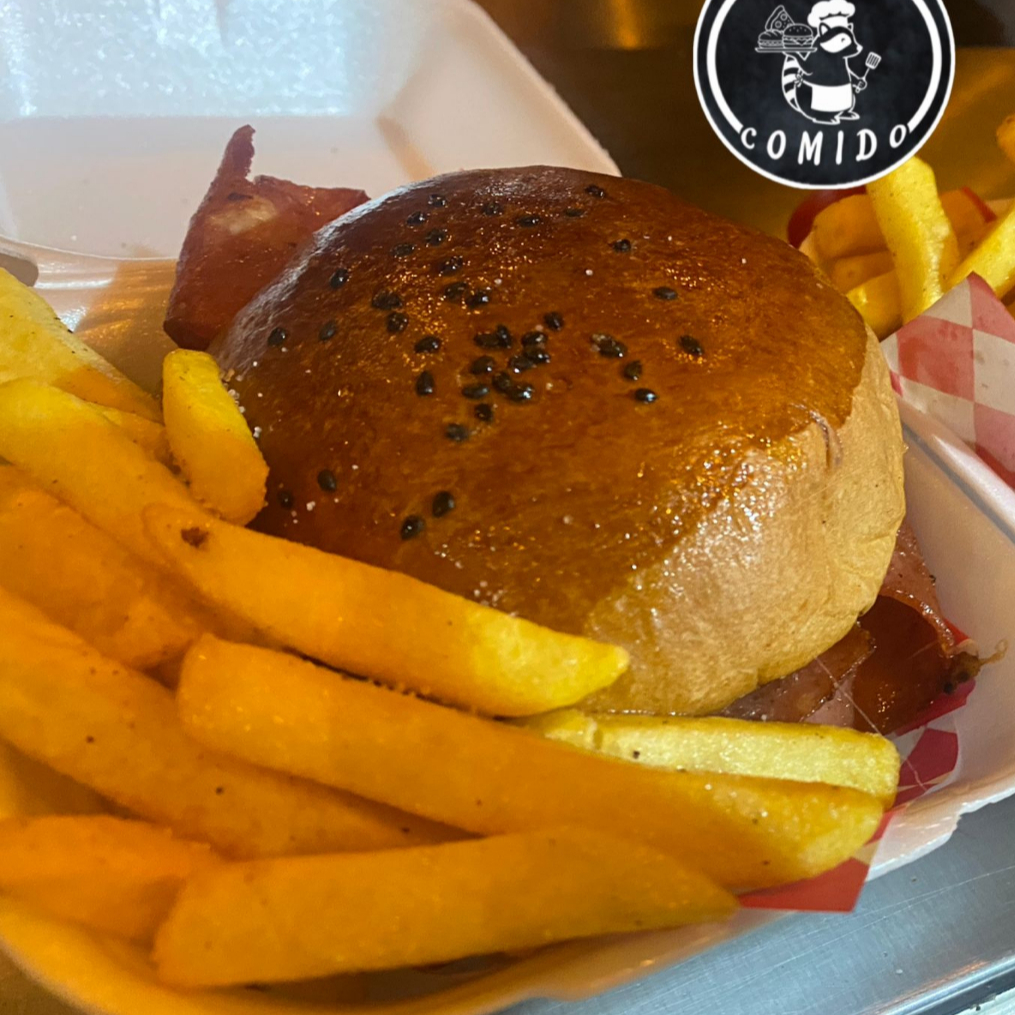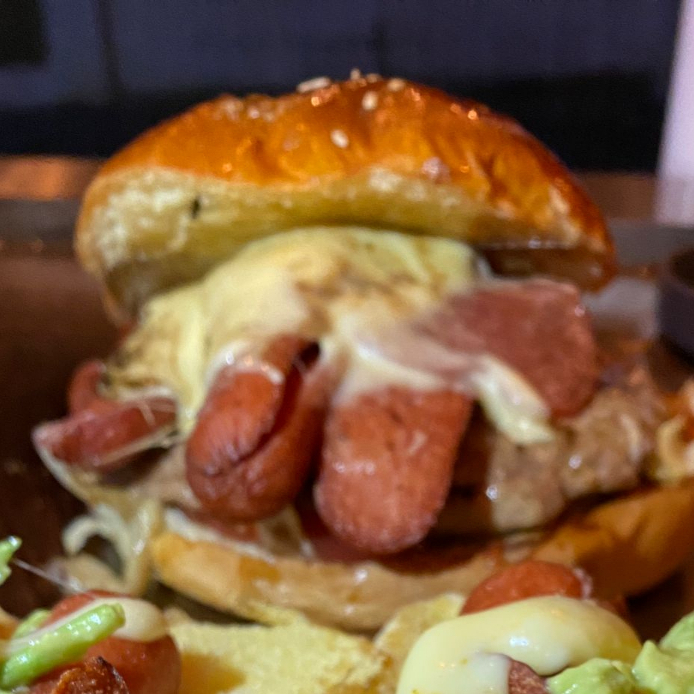 Carne de res, queso manchego, tocino, salsa BBQ y aros de cebolla.