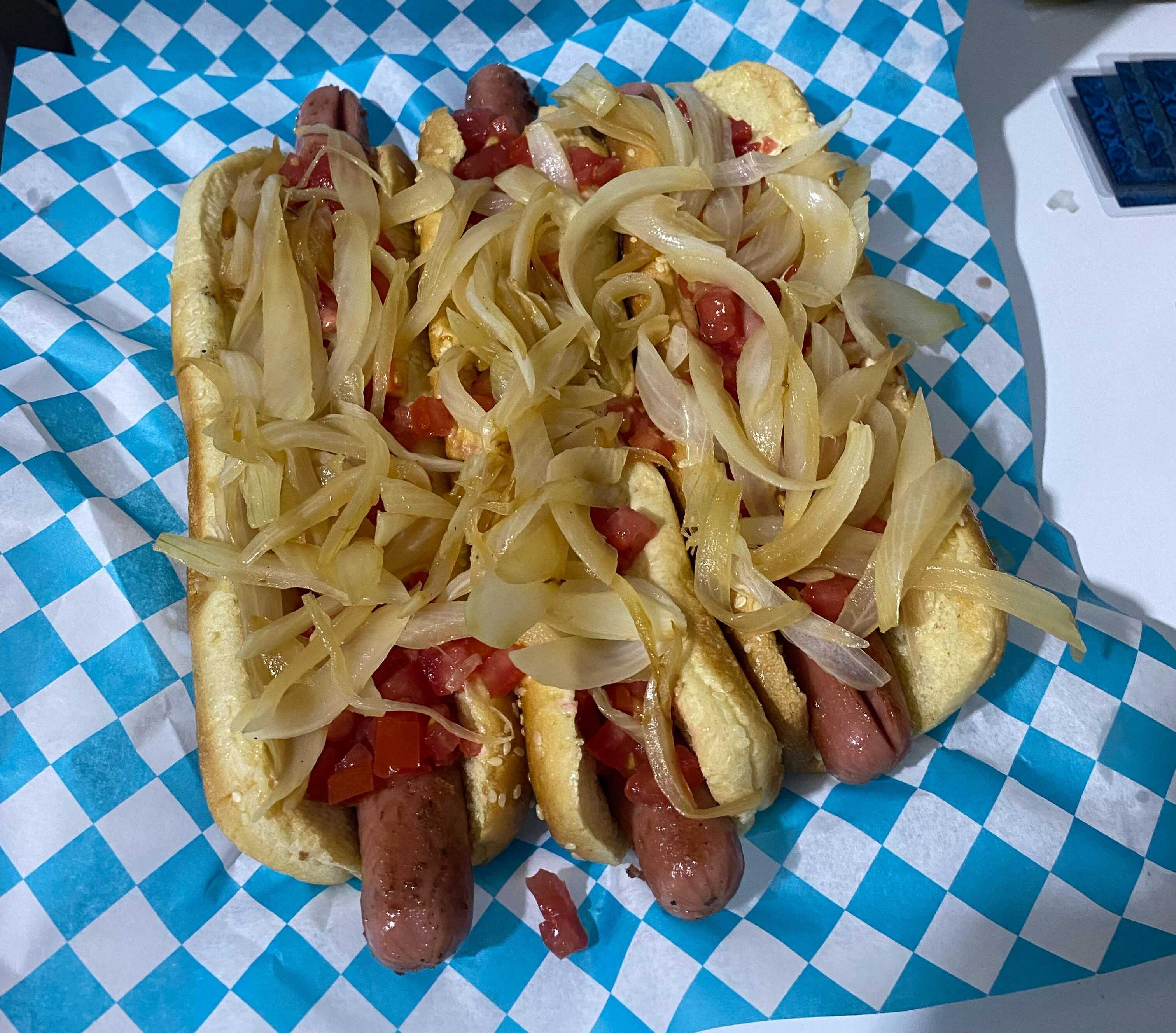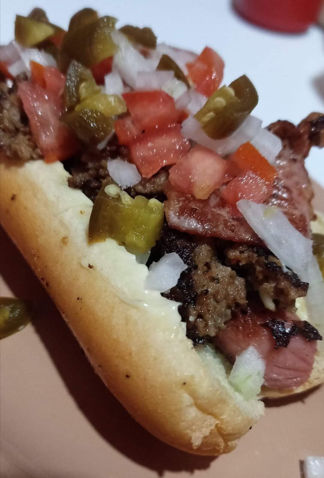 Hot dog con carne de hamburguesa, tomate, cebolla y chiles.