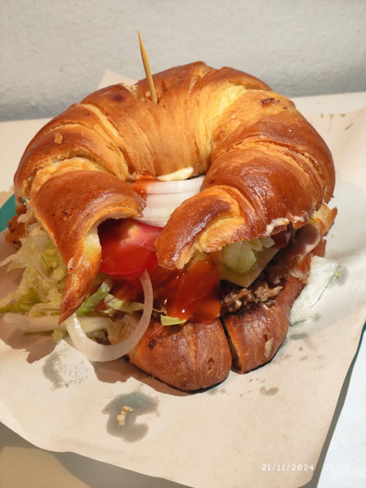 Cuernito con carne de hamburguesa, jamón, quesillo y queso amarillo.