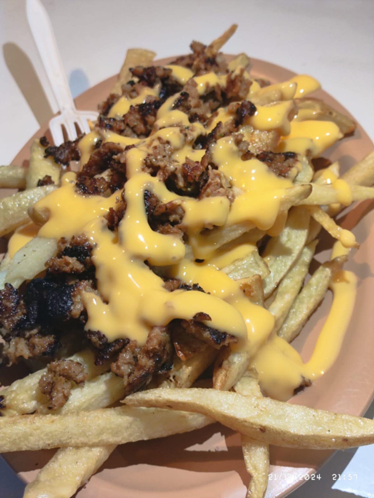 Papas fritas con queso amarillo y catsup.