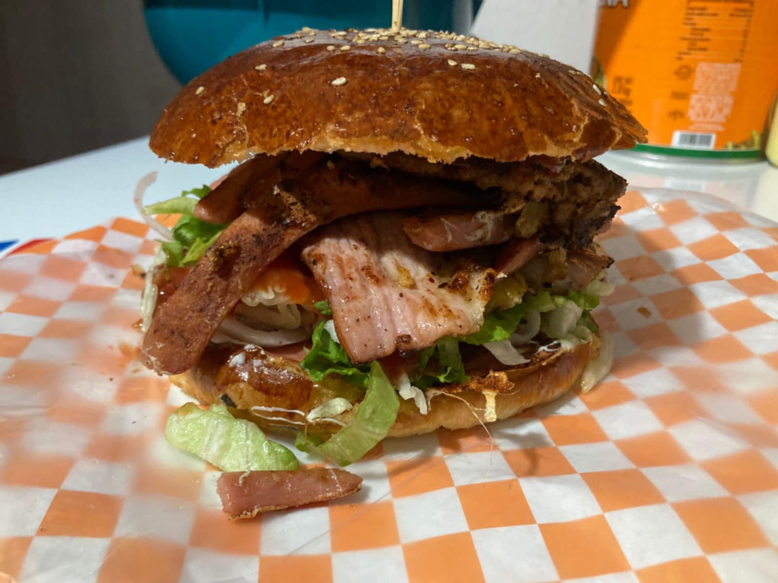 Hamburguesa con jamón, quesillo, queso amarillo, queso manchego, tocino y piña.