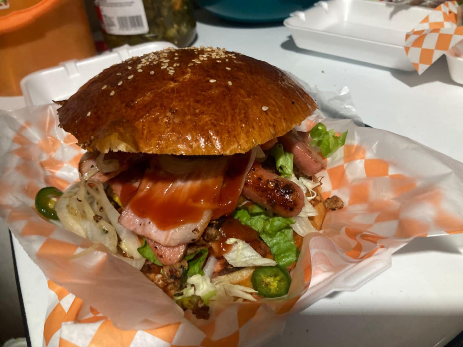Hamburguesa con jamón, quesillo, queso amarillo, queso manchego, piña, tocino, salchicha, cebolla y chile caramelizado.