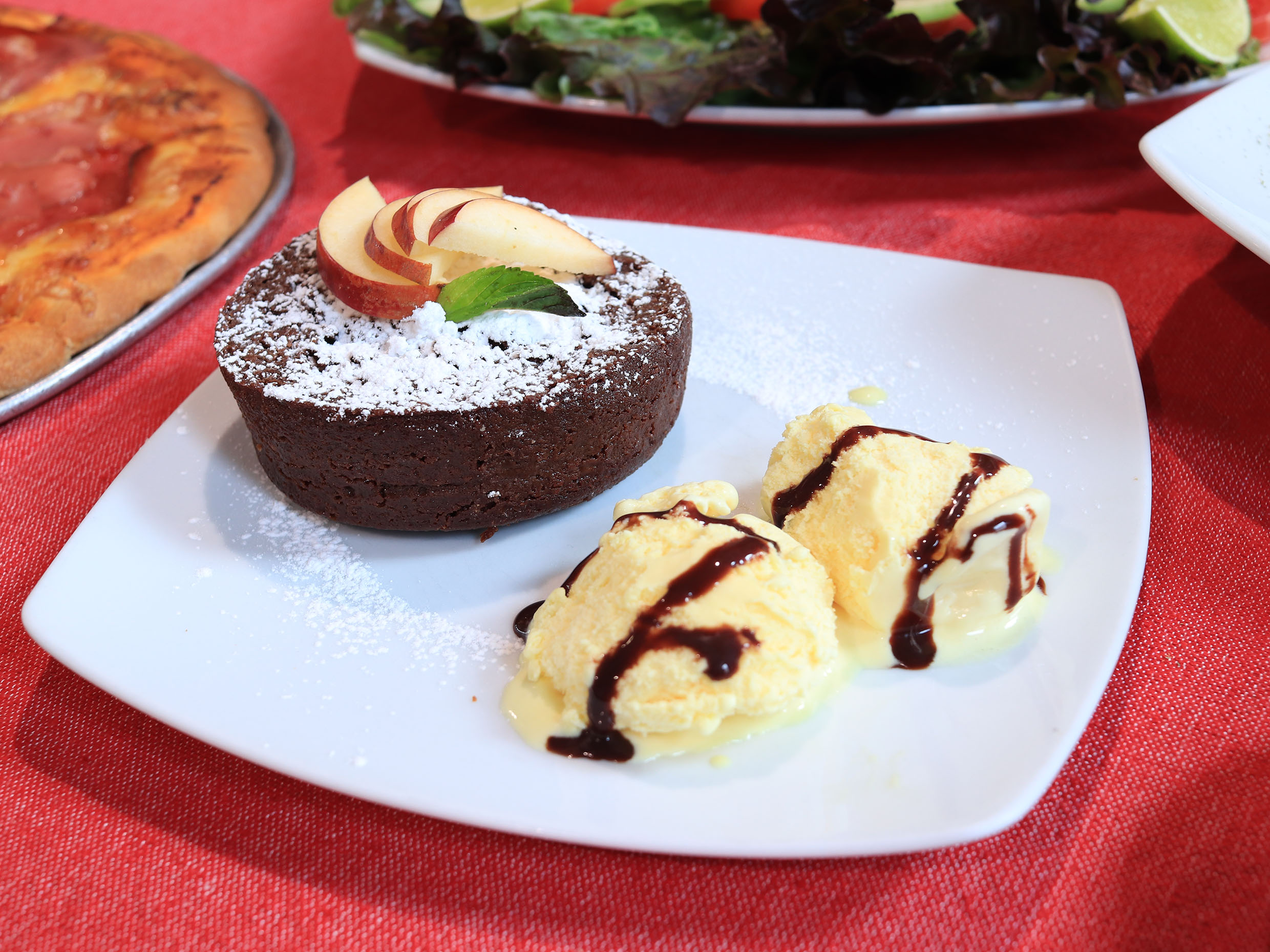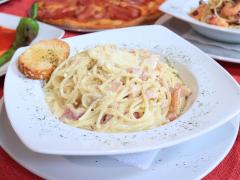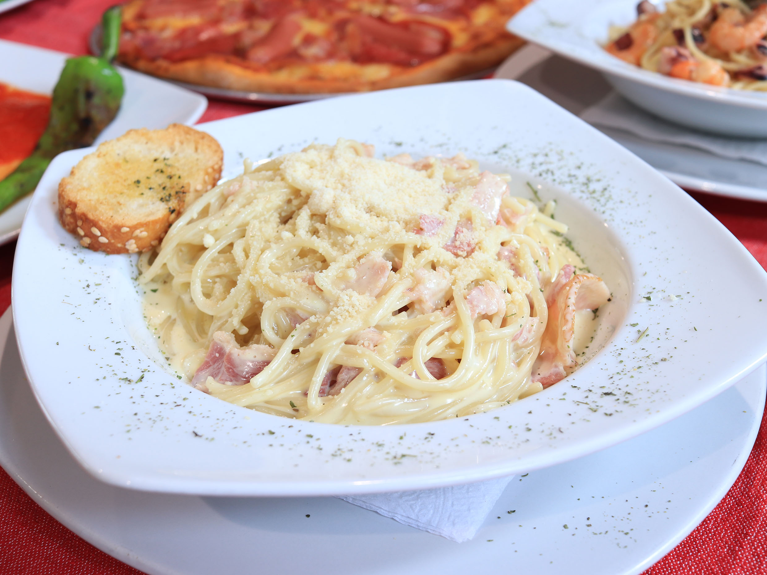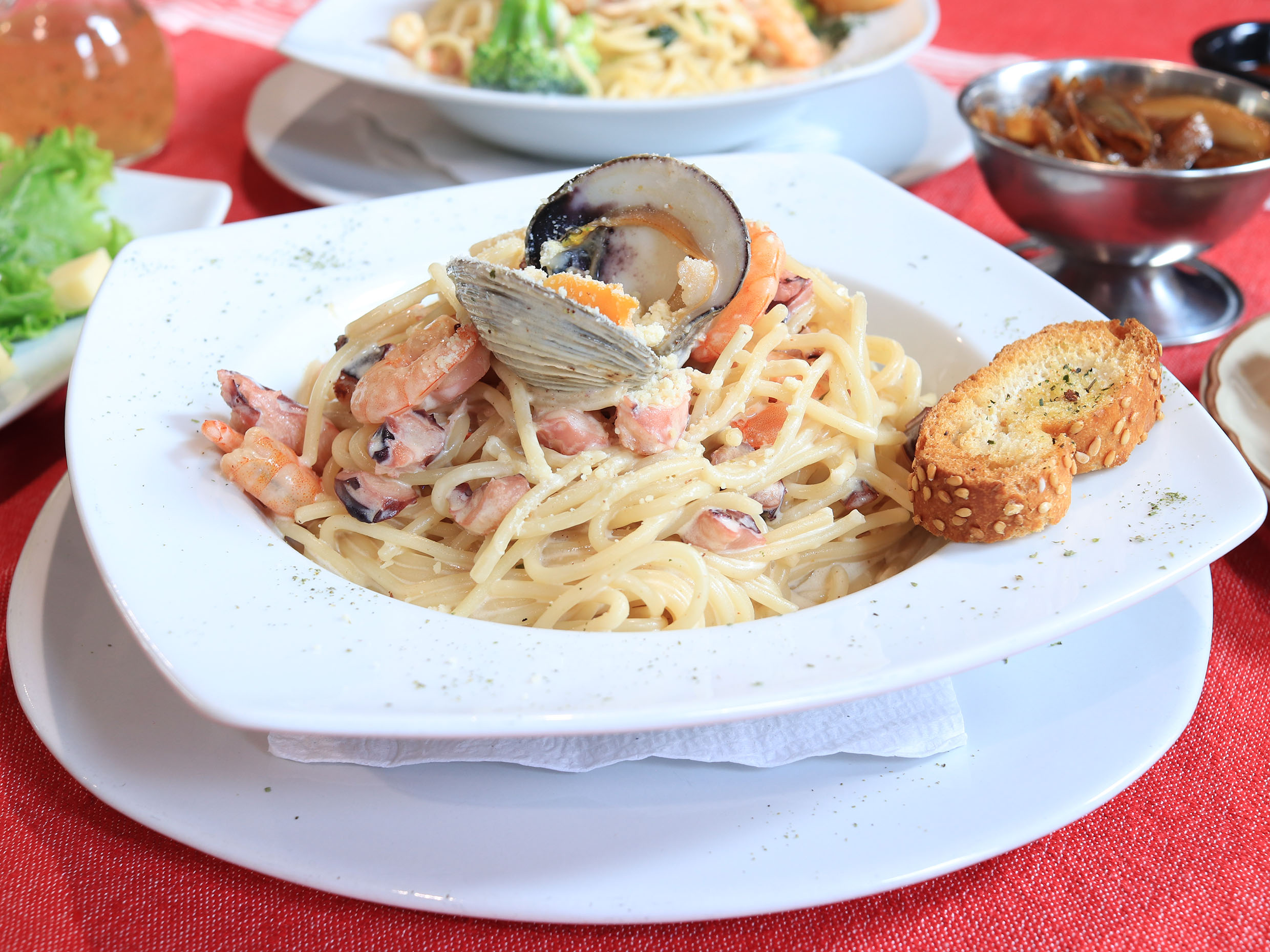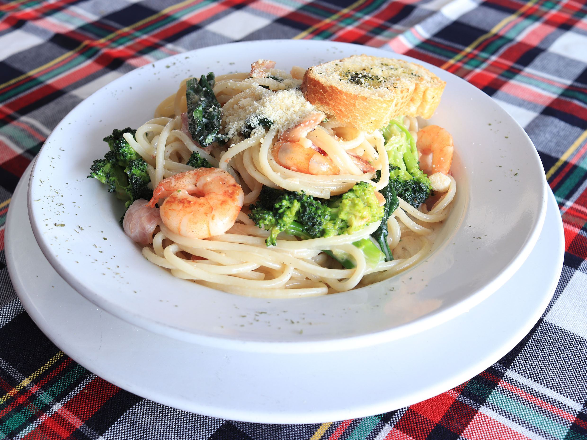 Espinacas, brócoli, camarón, tocino y parmesano.