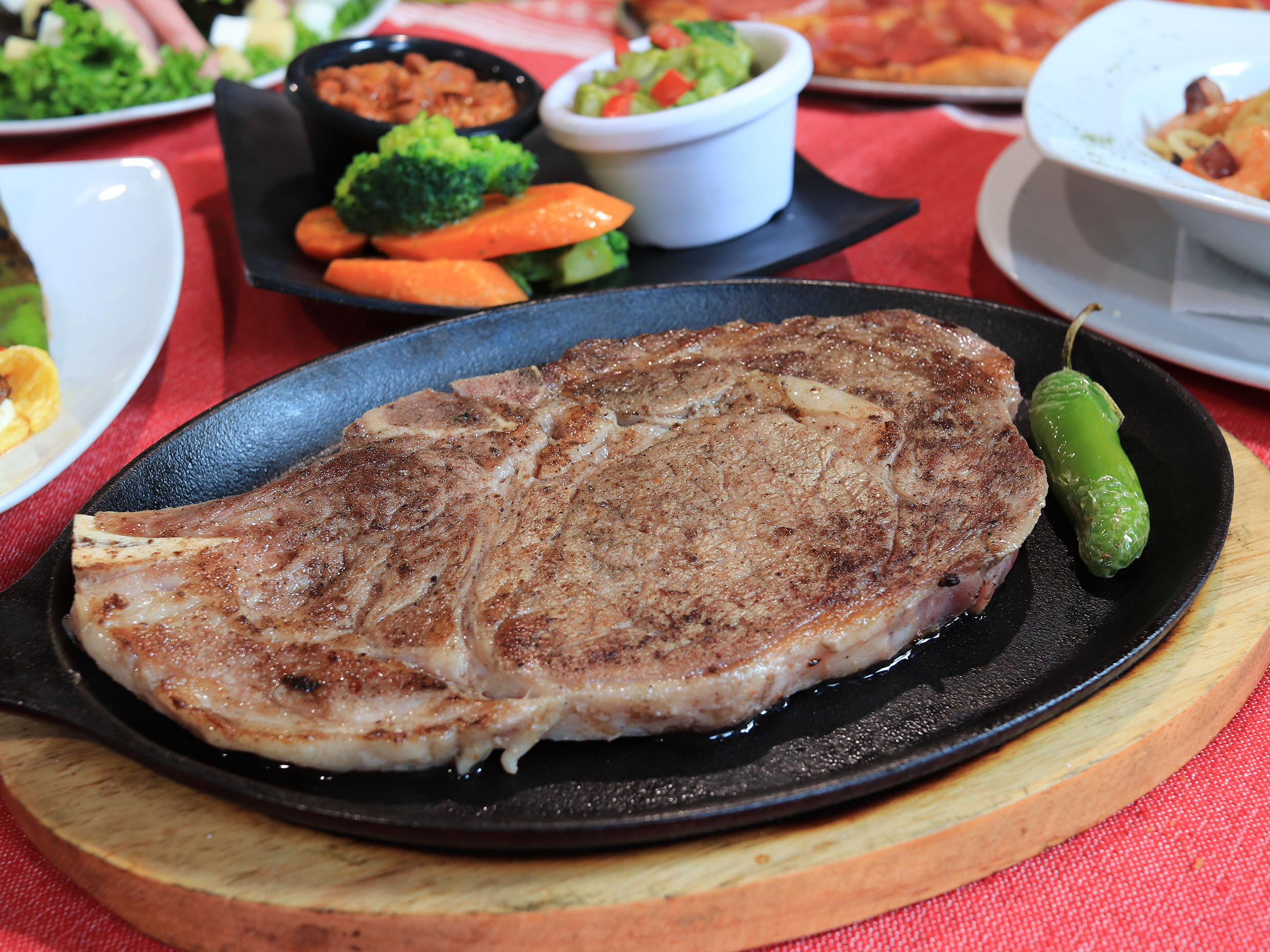 Huevos revueltos con chorizo, tocino, jamón o salchicha y acompañados de ensalada y frijoles refritos.