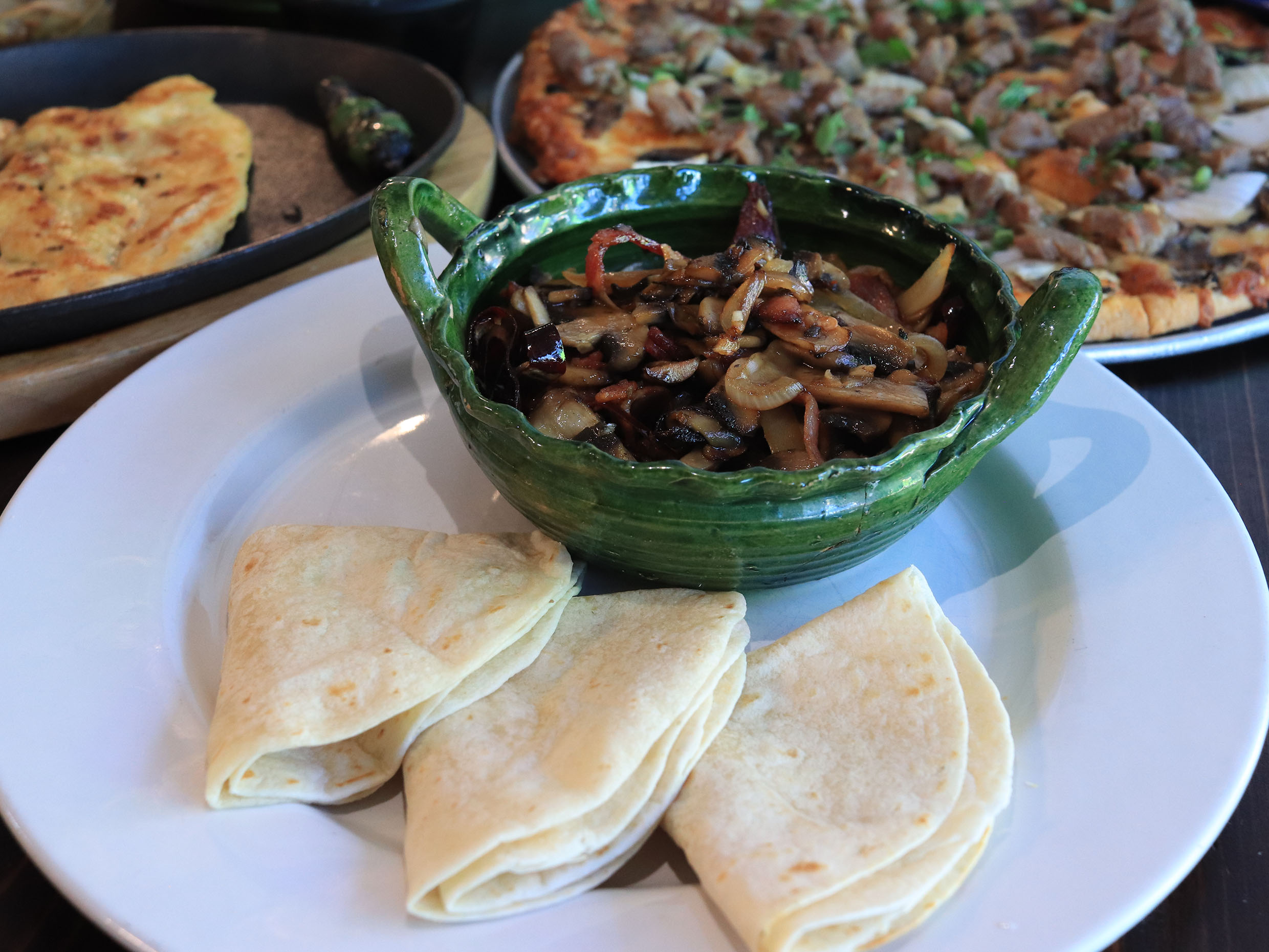 Champiñones, cebolla, tocino, chile seco, servido con tortillas de harina.