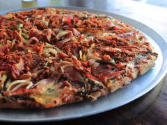 Pimiento, cebolla, tocino, queso manchego y pollo.