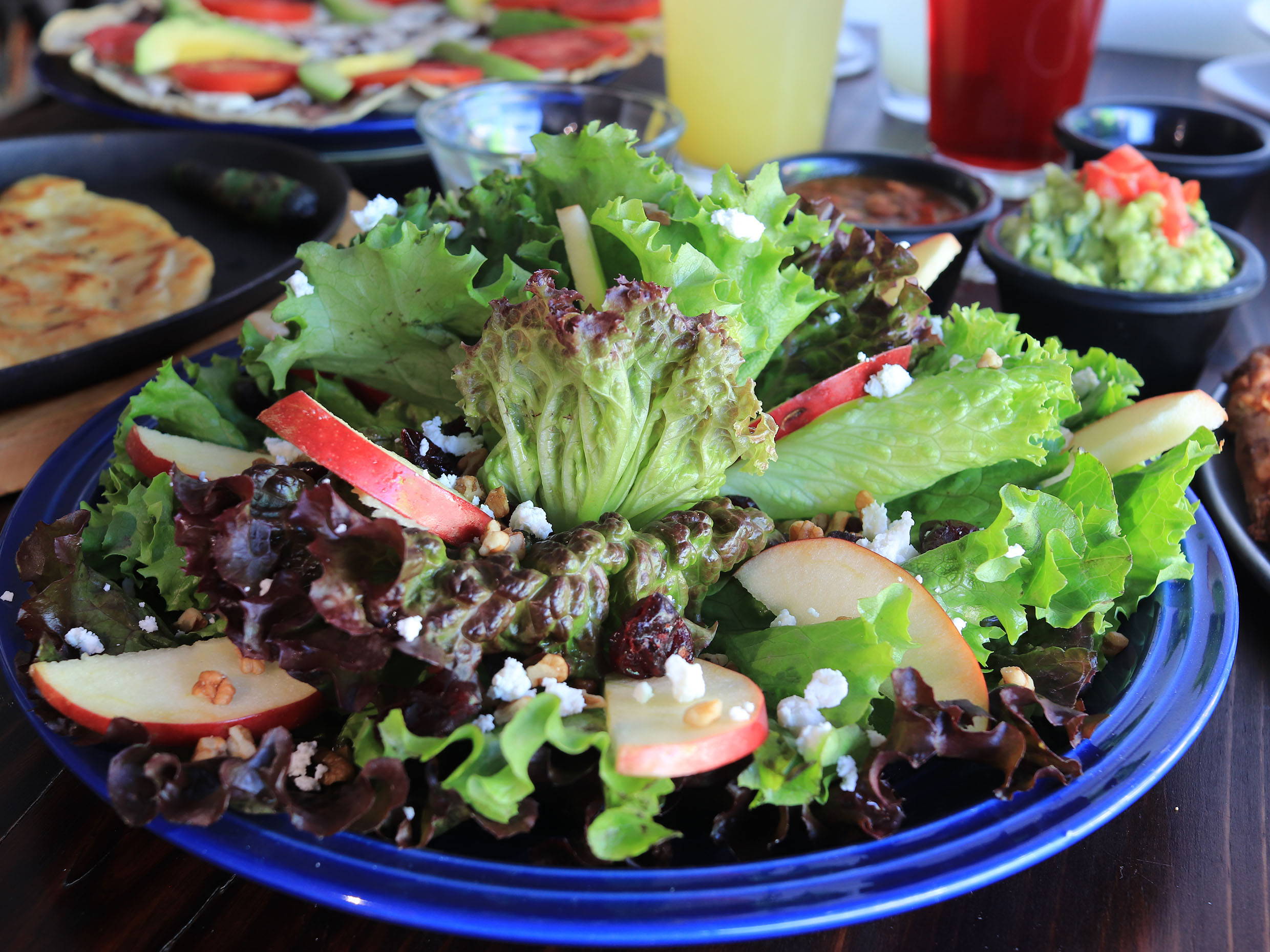 Lechuga, manzana, arándanos, queso de cabra y nuez.