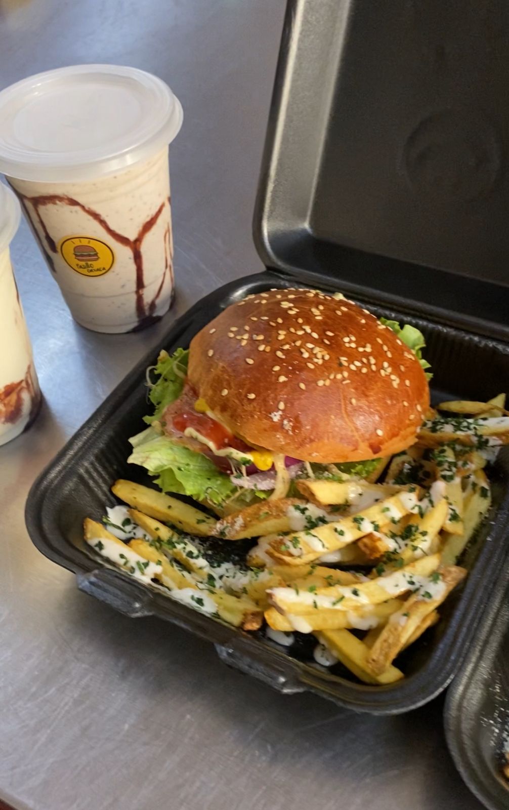 Carne de res, queso manchego, tocino, cebolla caramelizada y aderezo BBQ, incluye papas.