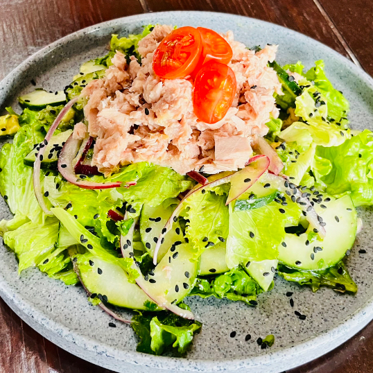 Atún sobre Cilantro, Pepino, Cebolla Morada, Lechuga y Tomatito Cherry. Sazonada con Limón, Sal y Aceite de Oliva, espolvoreada con Ajonjolí Negro