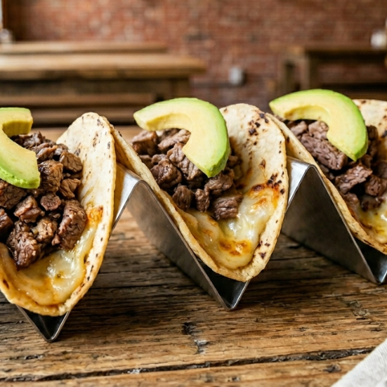 3 tacos en tortilla de harina con queso y rebanada de aguacate, elige tu carne favorita: Aguja de costilla o Chorizo Argentino