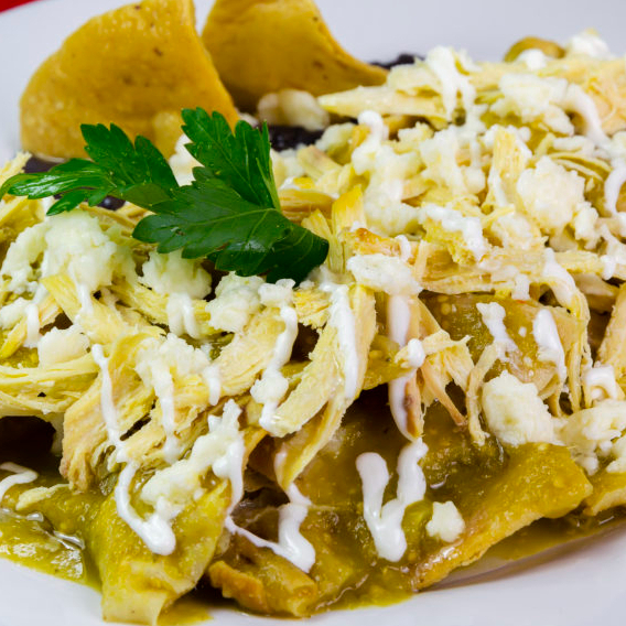 Totopos fritos bañados en salsa a elegir (verde o roja), llevan queso, crema y cebollita picada.