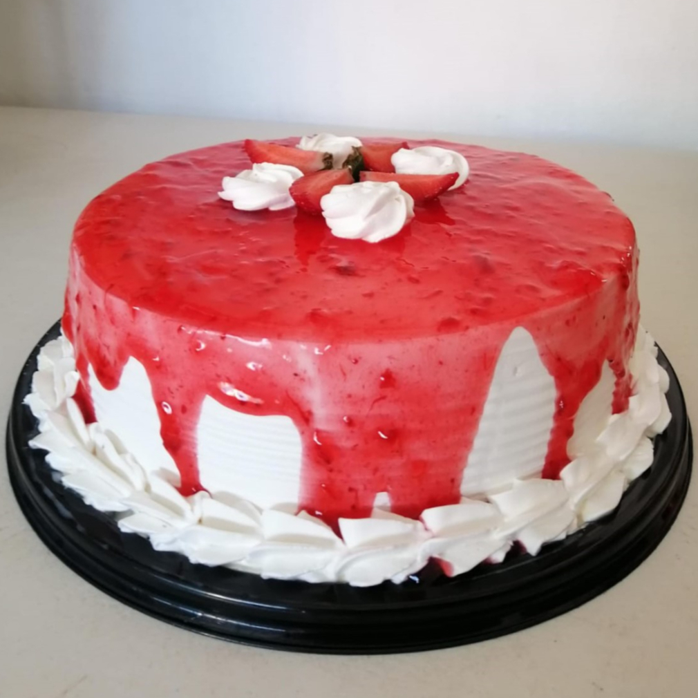 Pastel bañado en 3 leches relleno de fresa.