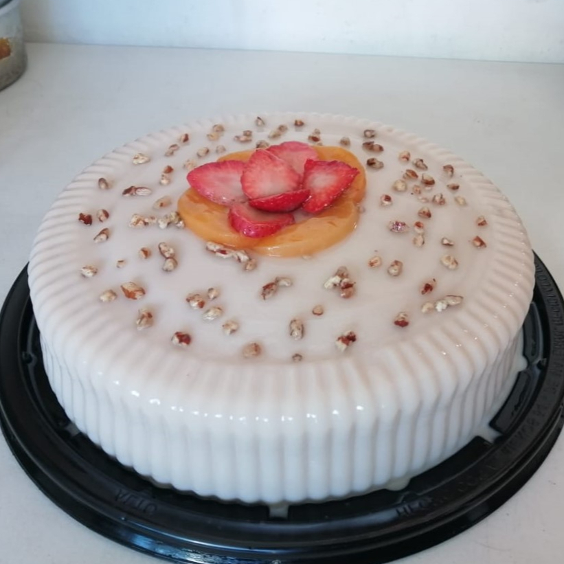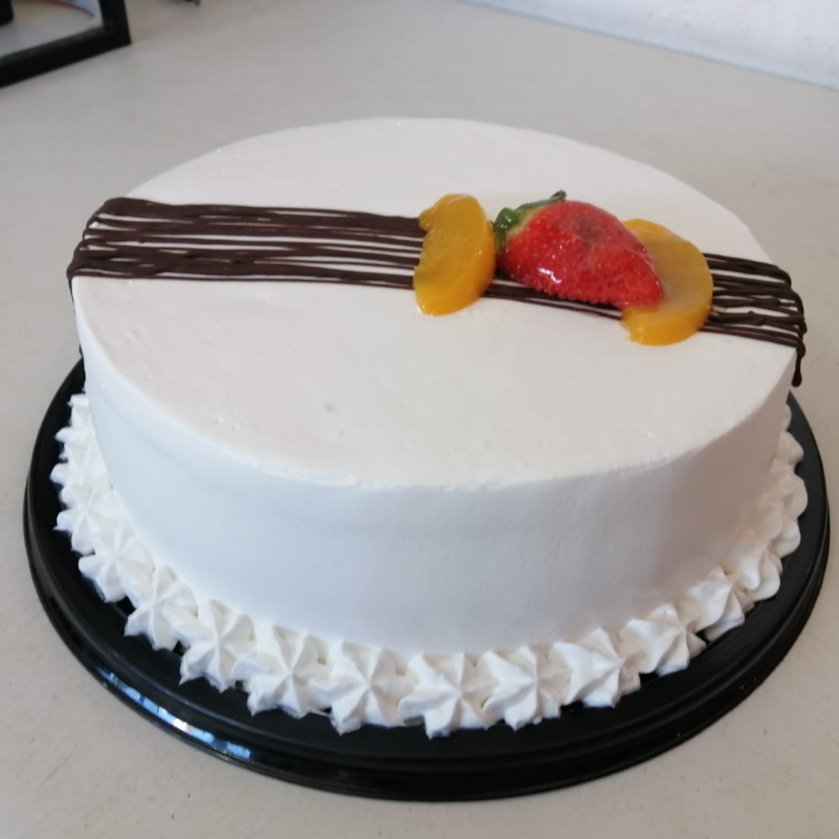 Pan de vainilla relleno bañado en tres leches, relleno de crema y duraznos, (10 personas).