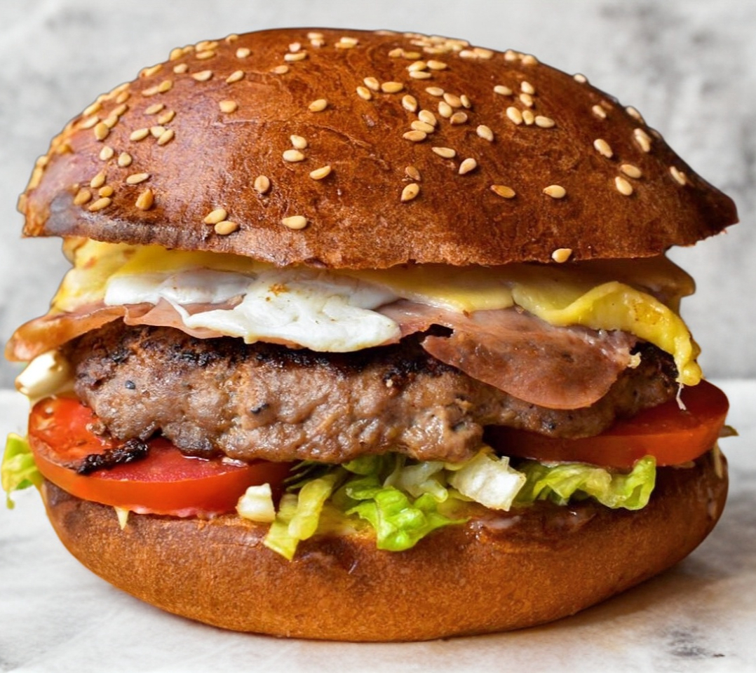 Carne 100% de res condimentada con especies de la casa, jamon, quesillo, queso gouda, mayonesa, lechuga, tomate, jalapeños, catsup y mostaza. (No se acompaña de ninguna guarnición)