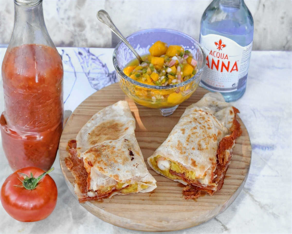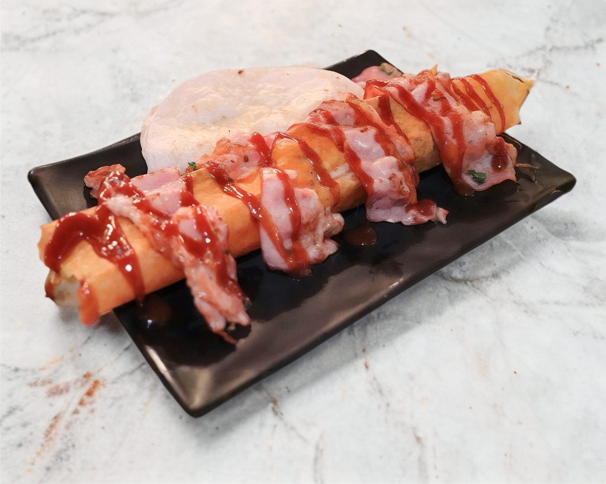 Taco de tortilla de harina con queso mozzarella gratinado a la plancha, tu especialidad favorita, tocino, salsa BBQ y ensalada.