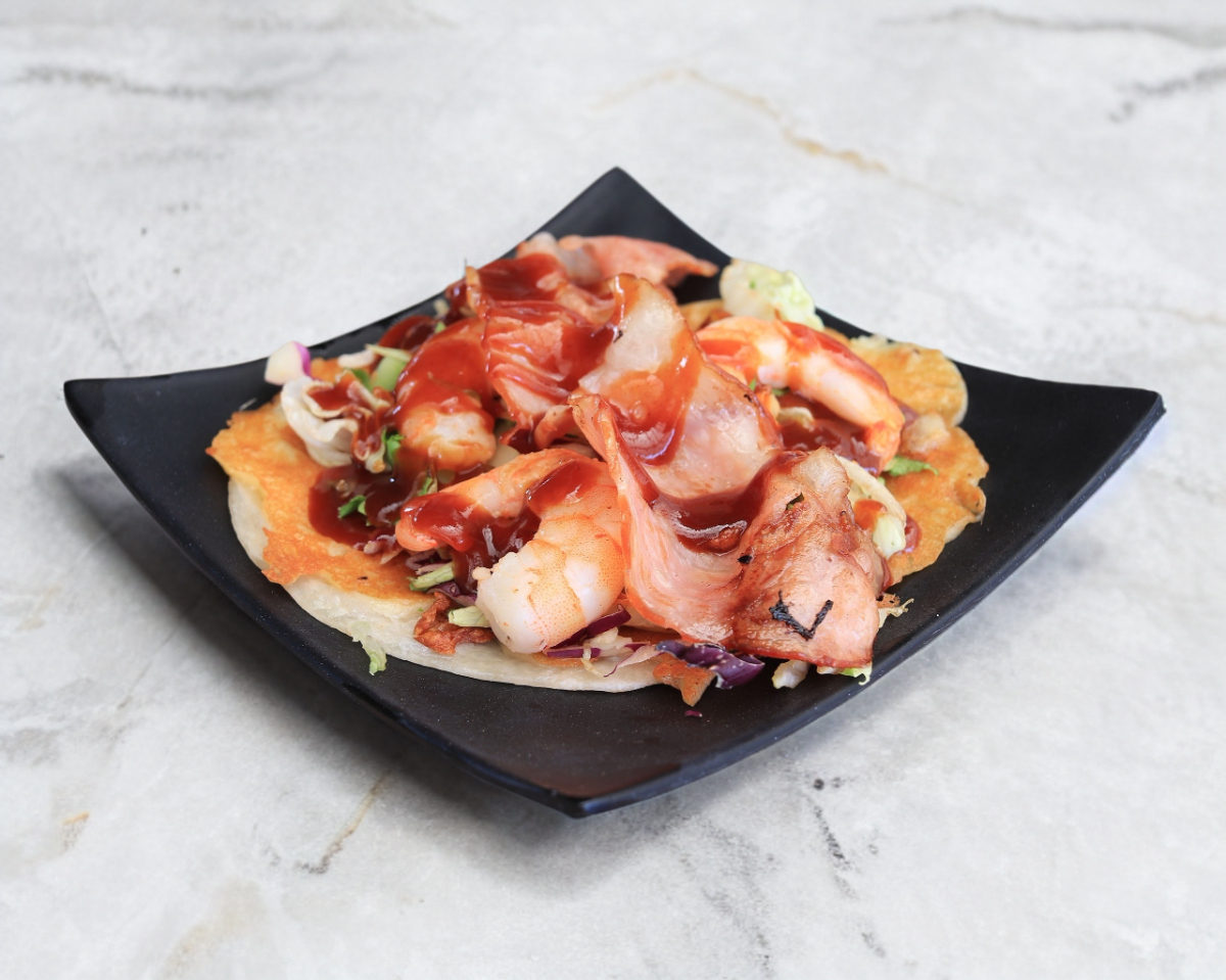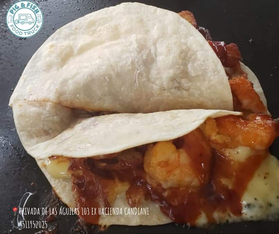 4 Tacos de tortilla de harina con queso mozzarella gratinado a la plancha rellenos de la especialidad que más te guste (3 a elegir) con tocino, salsa BBQ y ensalada.
