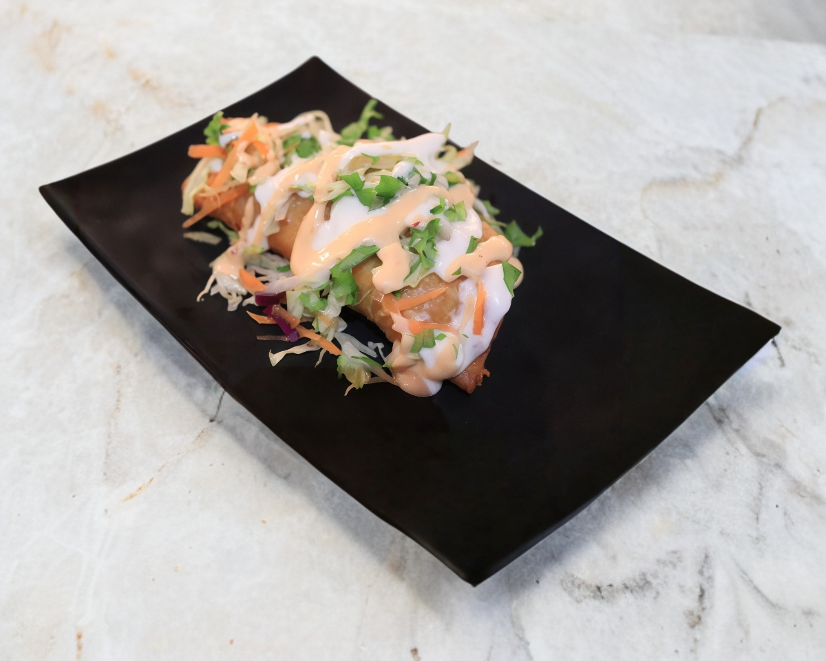 Empanadita rellena de camarón, queso mozzarella, piña y coco van acompañadas de aderezo de chipotle y ranch.