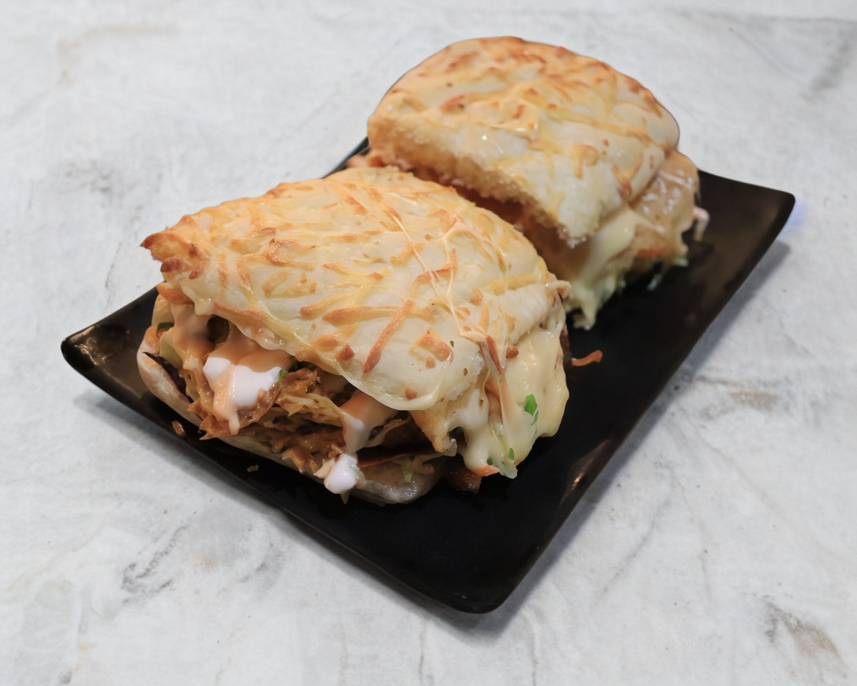 Queso mozzarella costra a la plancha relleno de cualquiera de nuestras 5 especialidades (2 a elegir), con tocino y salsa BBQ acompañada de tortillas de harina por un lado.