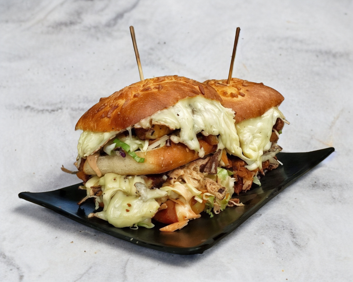 Pan italiano con queso gouda y queso cheddar gratinado en la parte de arriba, partido a la mitad con queso mozzarella gratinado a la plancha, ensalada mixta, aderezo de chipotle y ranch, rellenarla de la especialidad que más te guste (2 ingredientes a elegir).