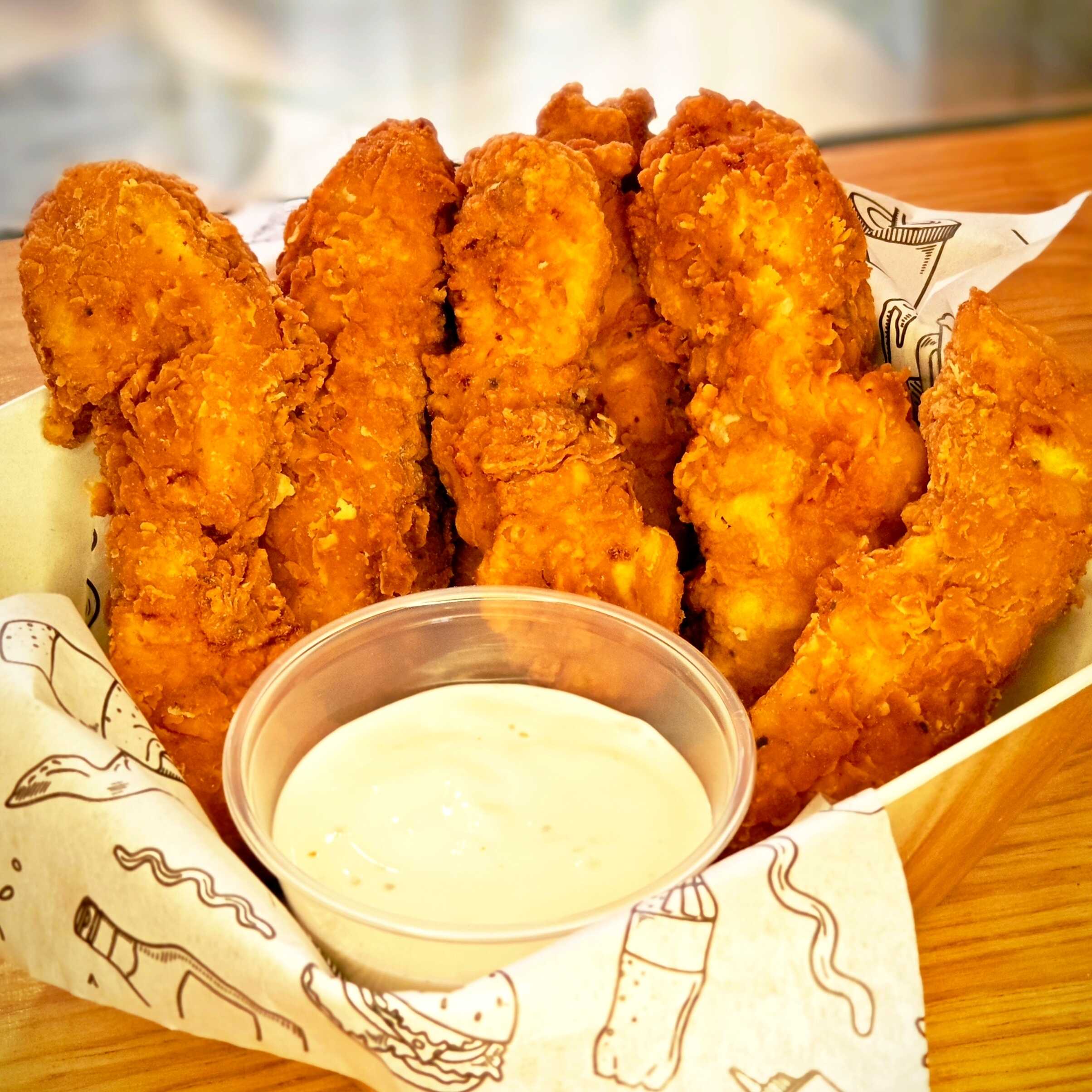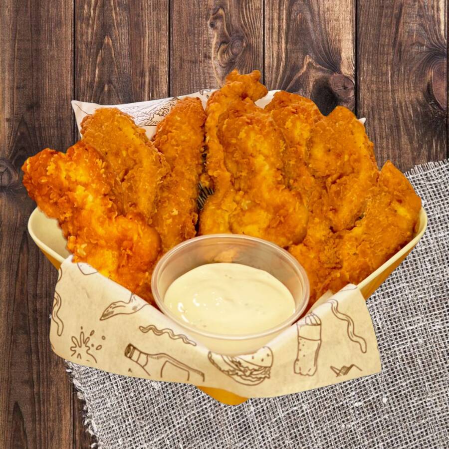 Tiras de pechuga de pollo condimentadas con especias y empanizadas en un acabado frito y crujiente. Acompañado de una salsa o un aderezo favorito.