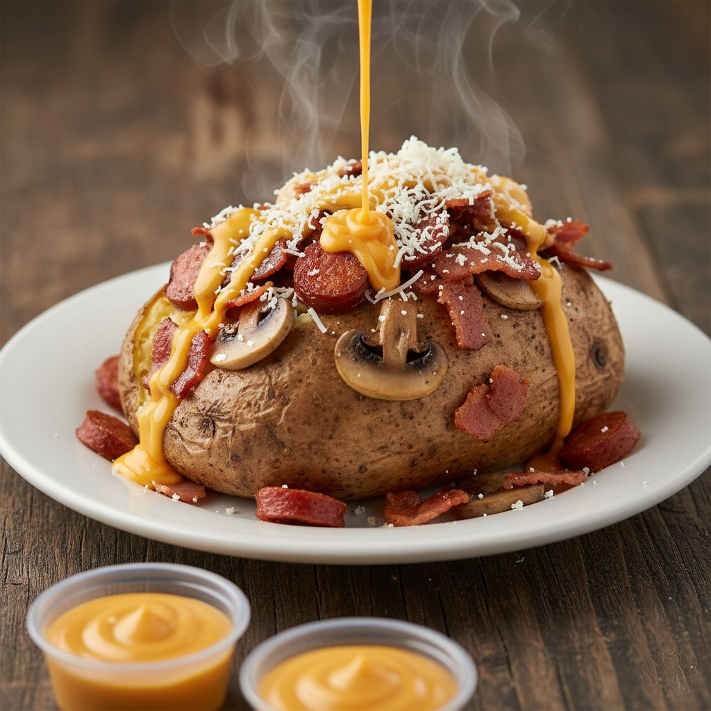 Papa al horno, rellena de champiñón, salchicha y tocino. Bañada en queso amarillo derretido y espolvoreada con queso blanco.