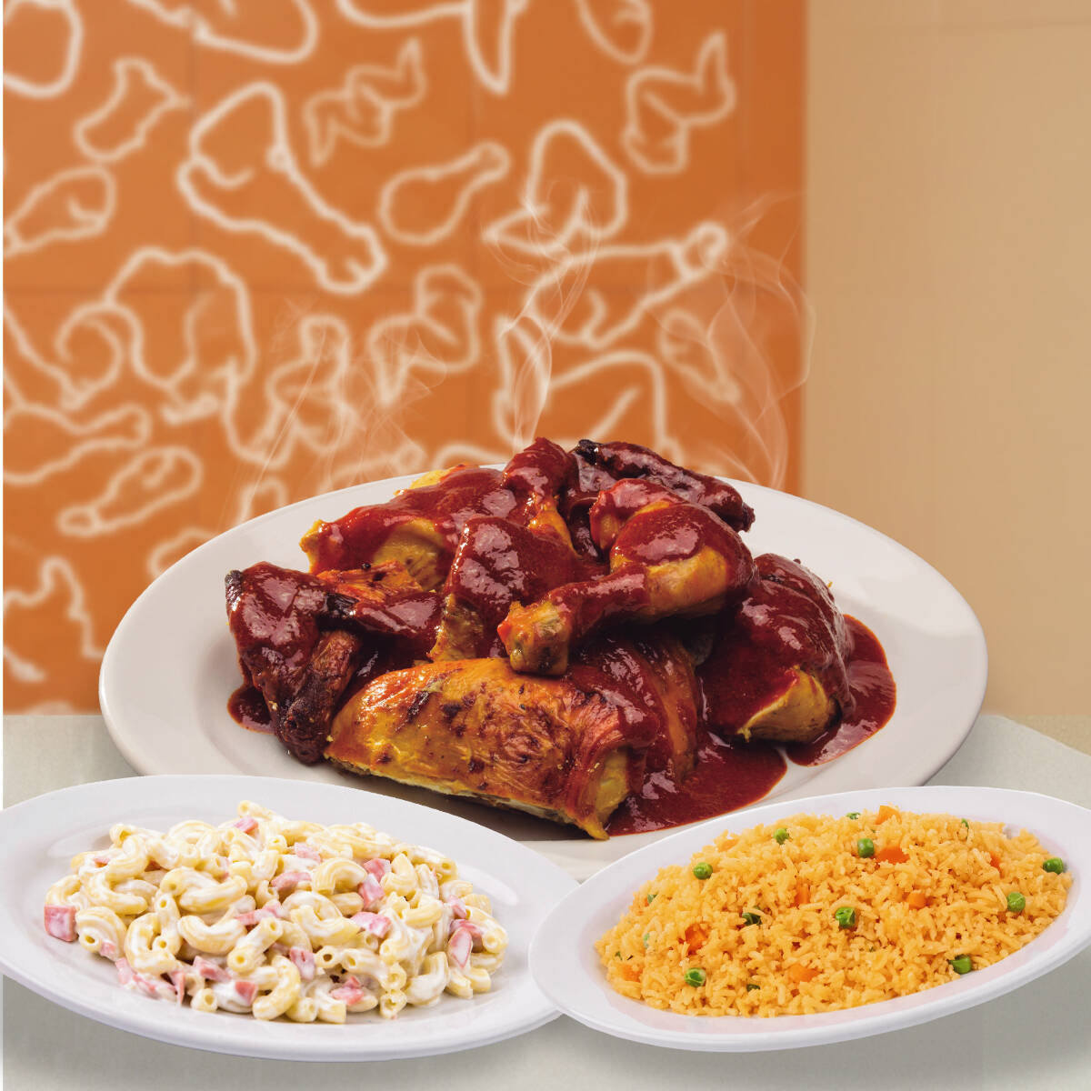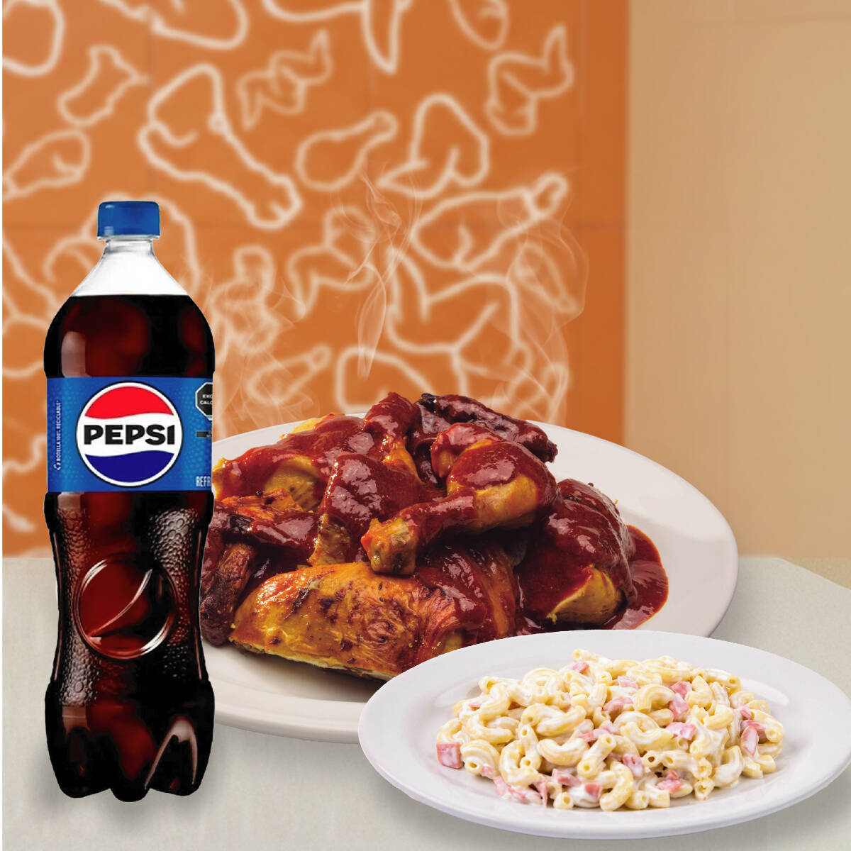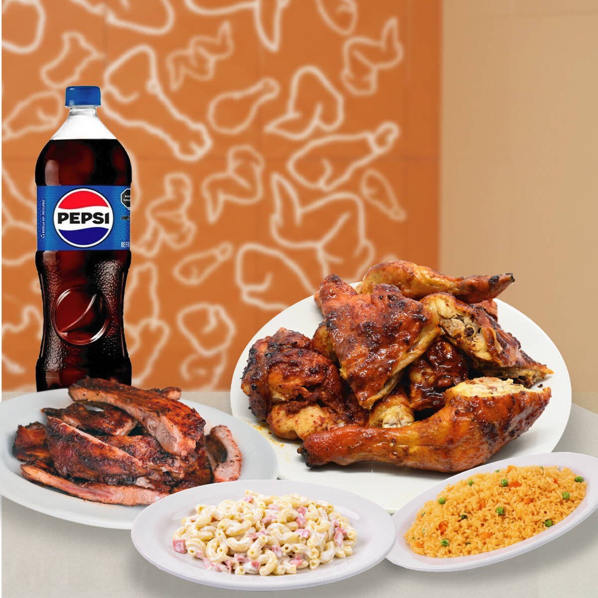 1 pollo ranchero adobado + 2 guarniciones + 1 pz de costillon + 1 refresco familiar + sabor