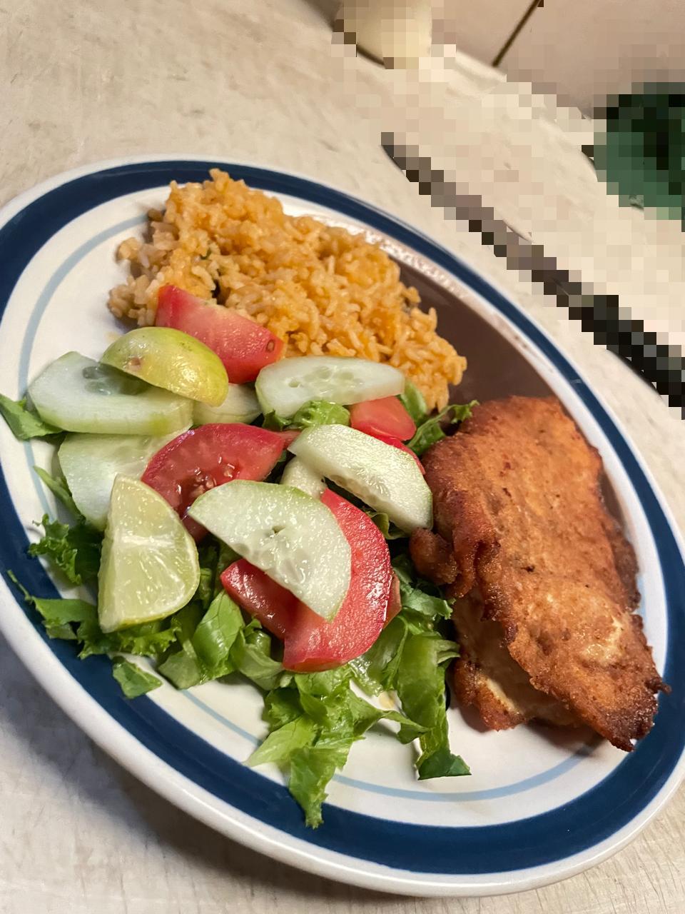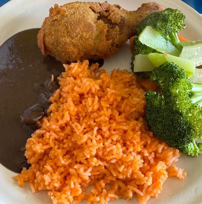 Pollo empanizado y 3 guarniciones del día (puede ser arroz, spaguetti, ensalada o frijoles).