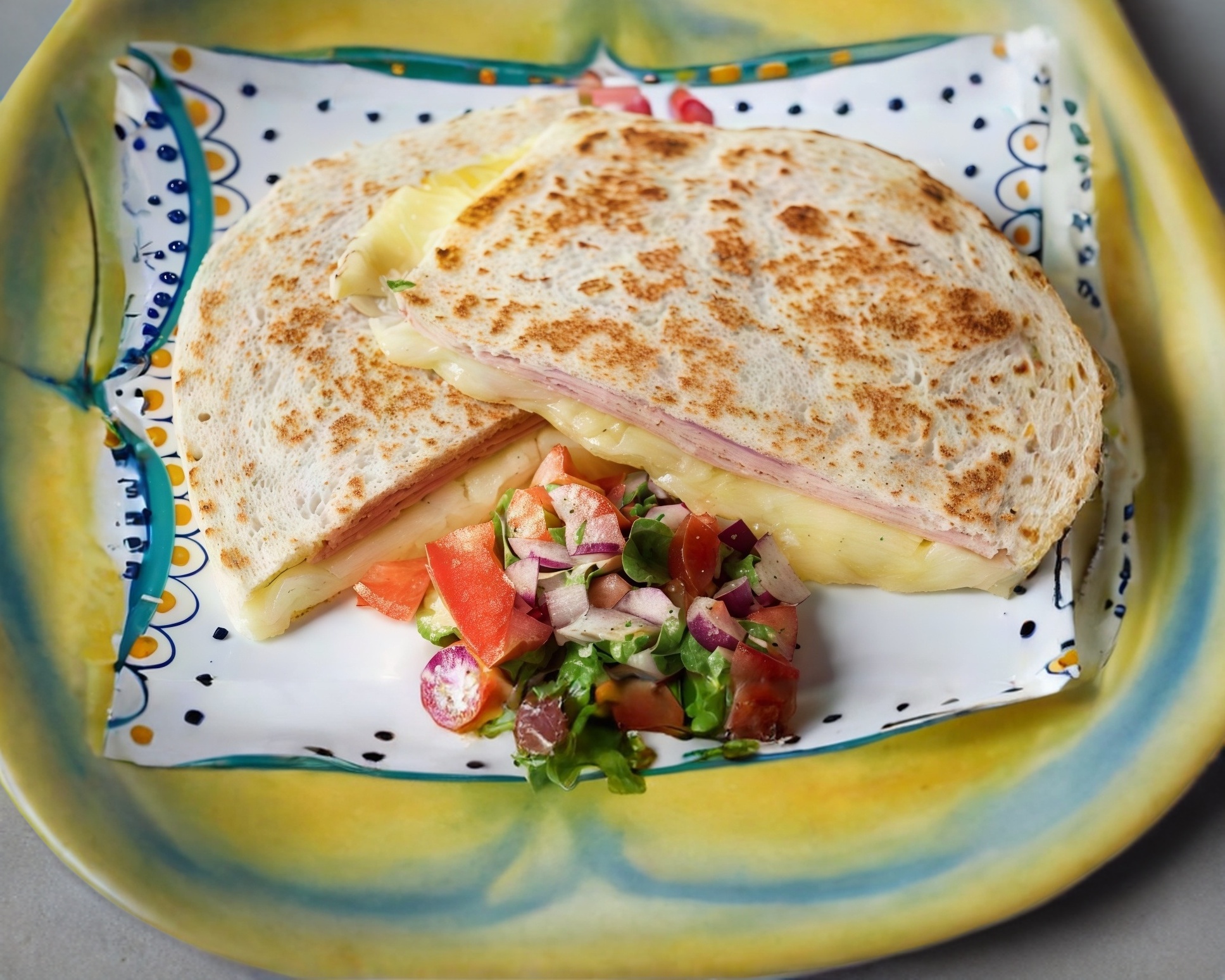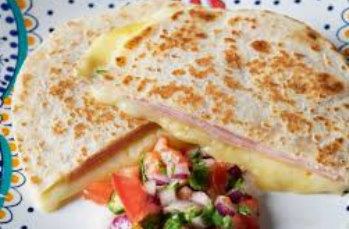Rebanada de jamón, quesillo y queso amarillo.