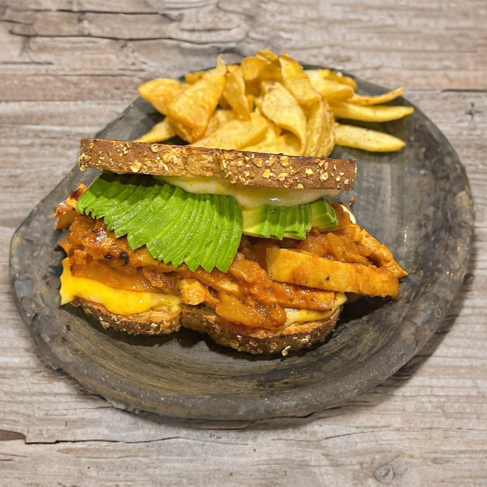 Pollo a la BBQ, cebolla caramelizada, tocino, queso gouda y espinaca en pan baguette.