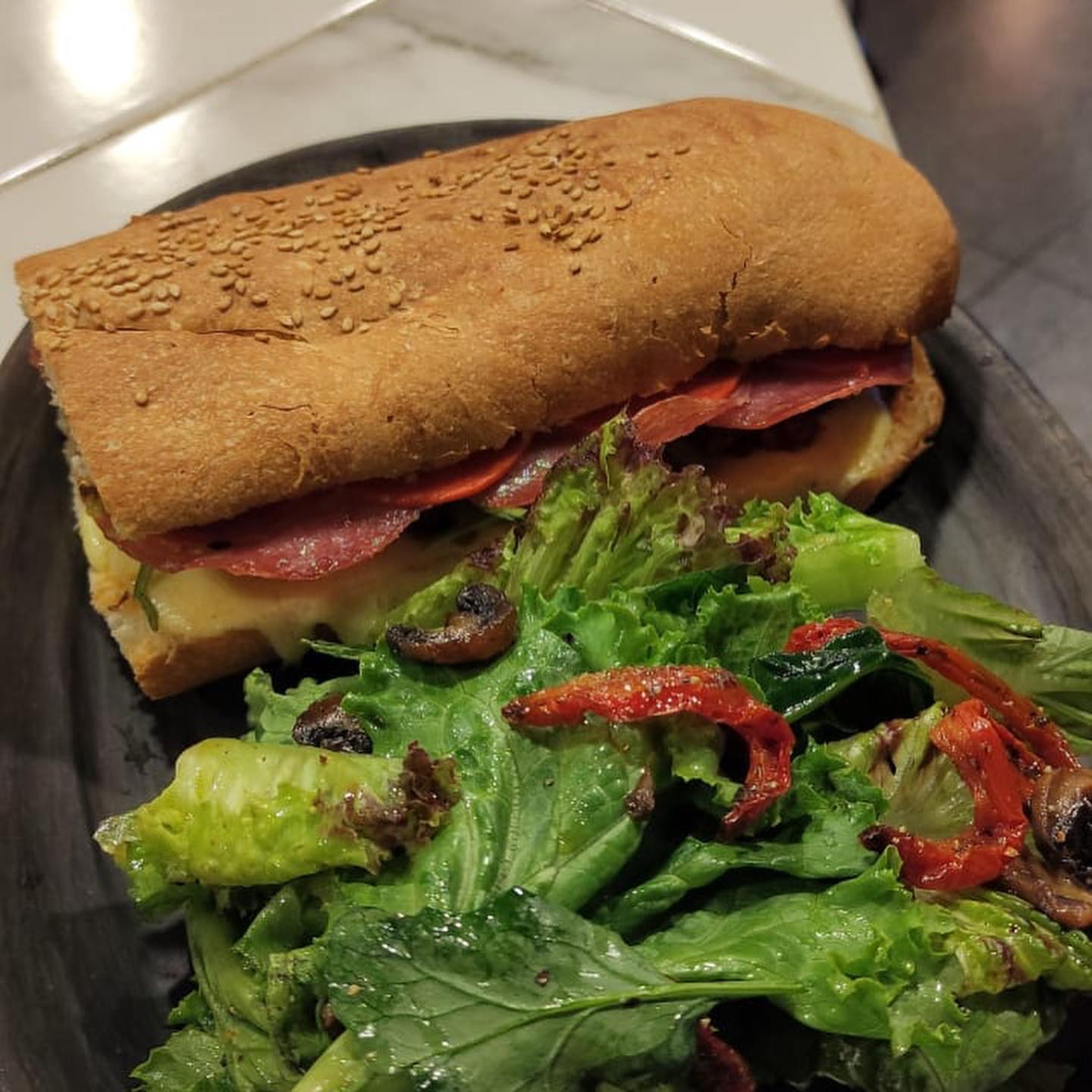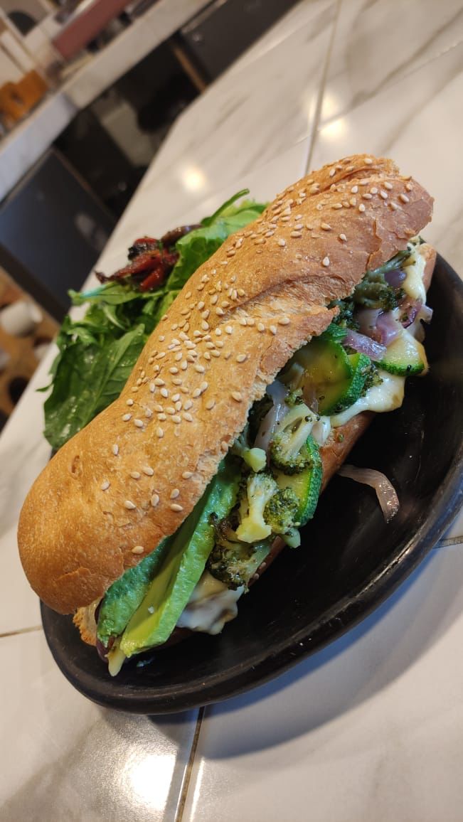 Todo a la plancha, salsa italiana+calabaza+cebolla caramelizada+brócoli+champiñones+aguacate+queso gouda en pan baguette