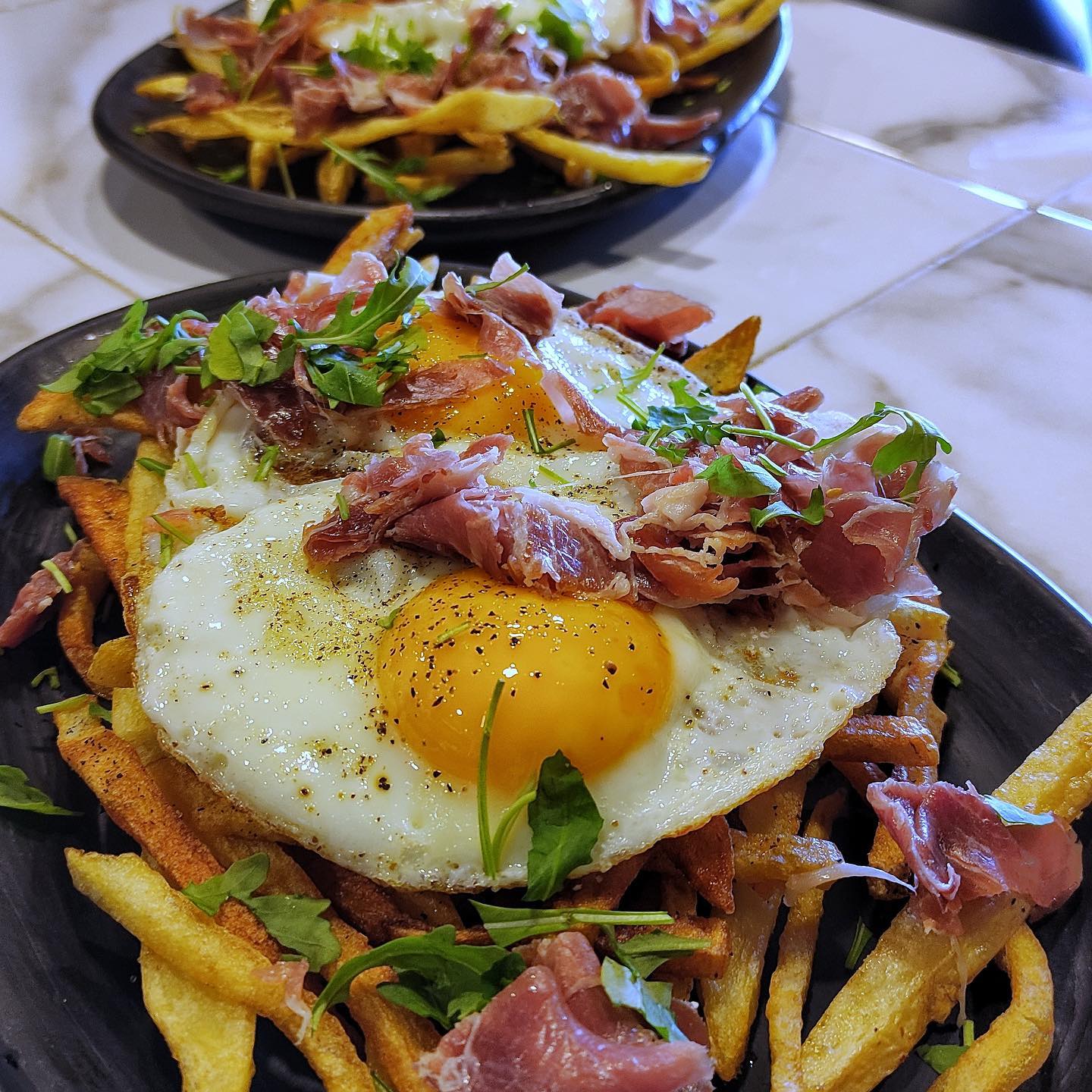 Jamón serrano, papas fritas y huevo estrellado
