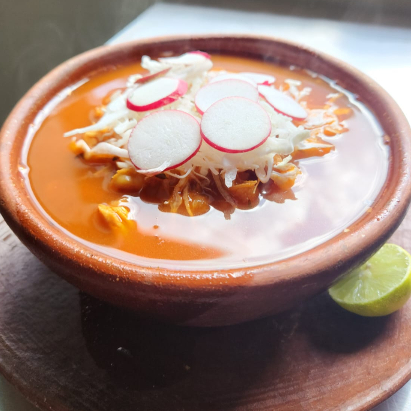 Pozole rojo pollo aprox. 500 ml acompañado de col, rabano, guacamole, limon, chilito, oregano y 2 tostadas naturales