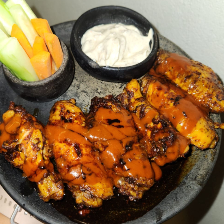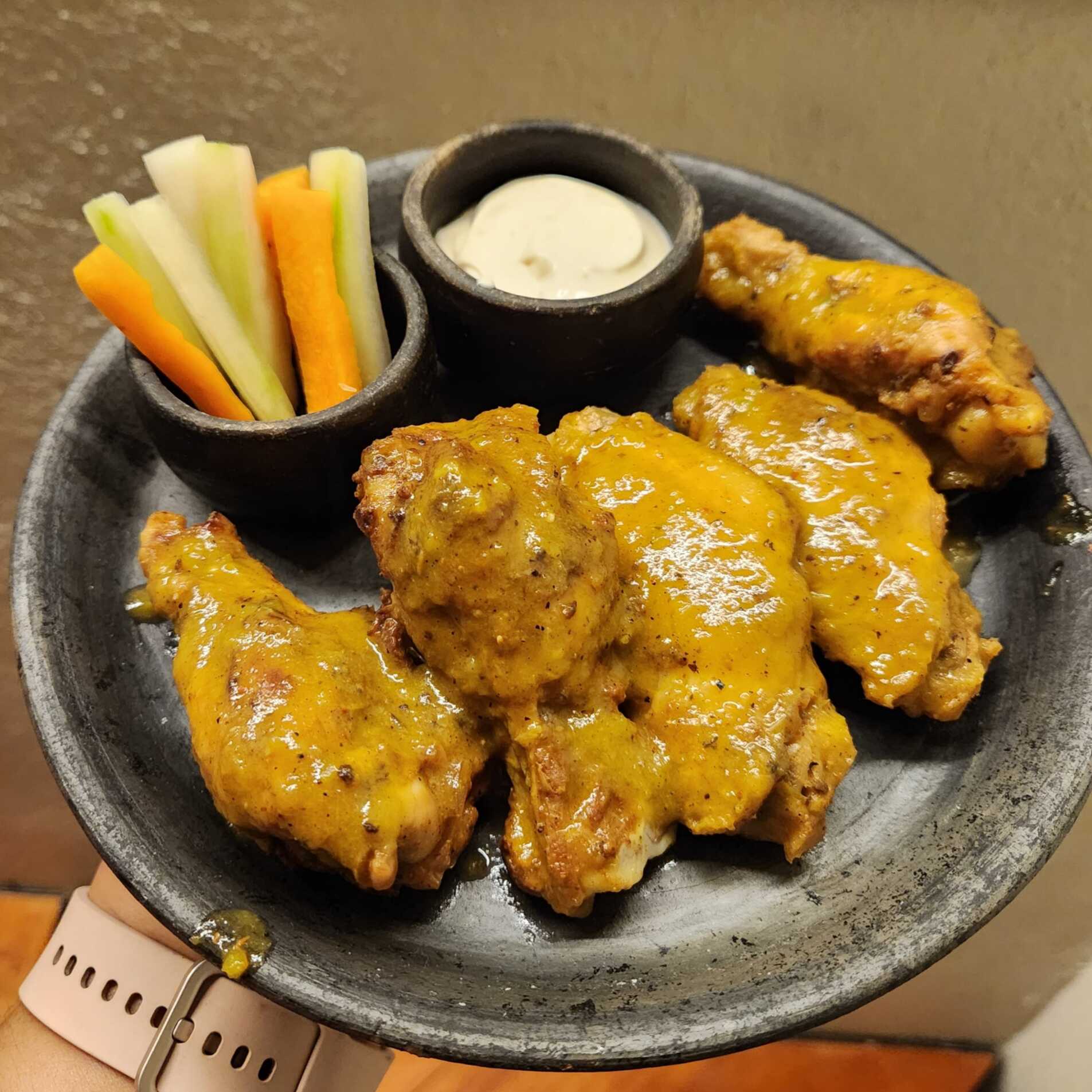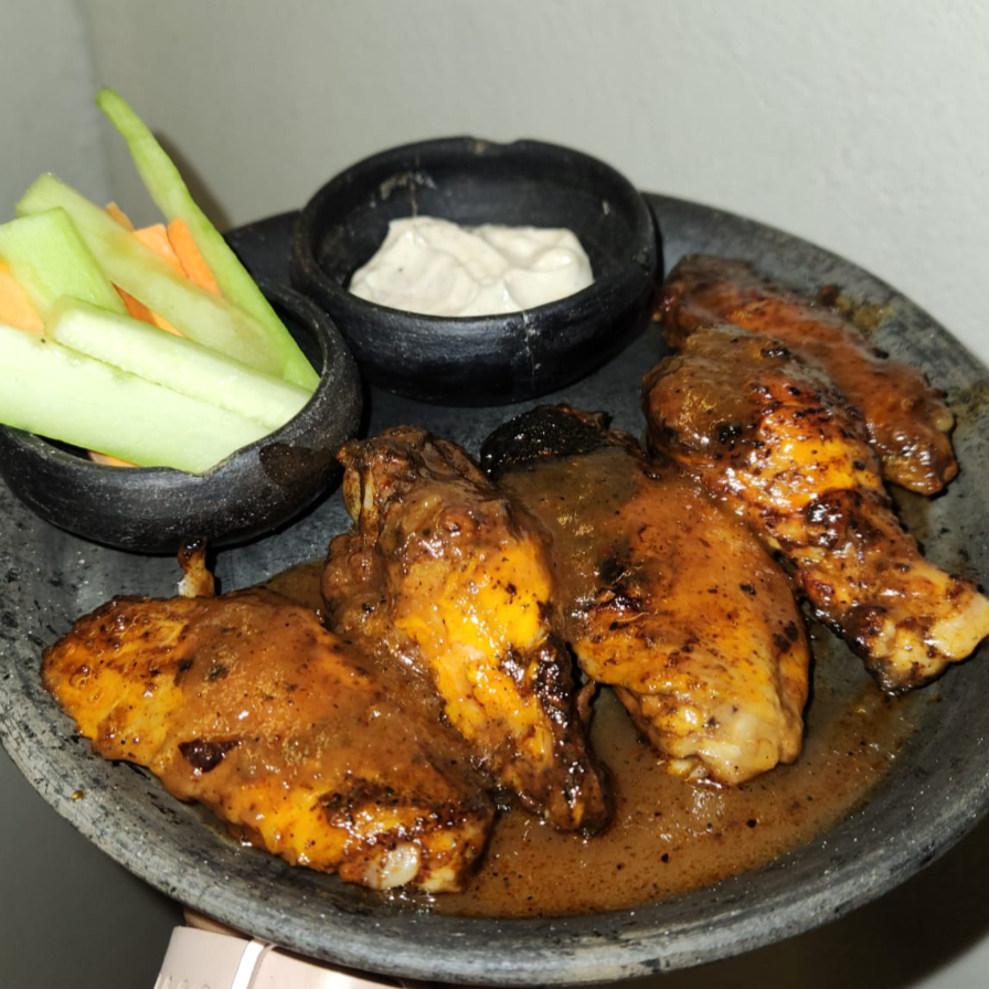 5 Alitas asadas sabor mango bañadas en salsa casera de mango acompañadas de pepino, zanahoria y aderezo de la casa.