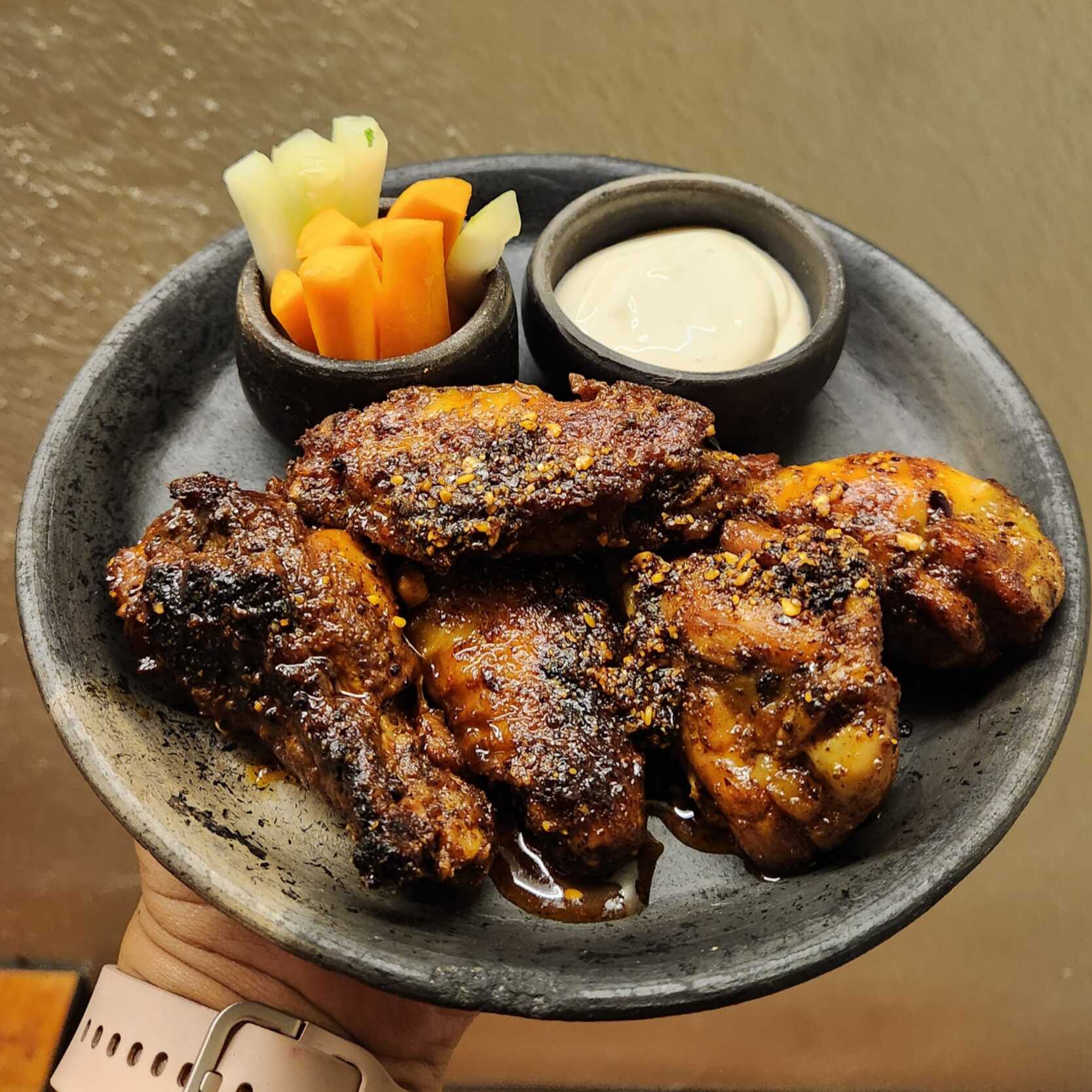 Orden de 5 alitas asadas bañadas en salsa de chiles secos acompañadas de pepino, zanahoria y aderezo de la casa.
