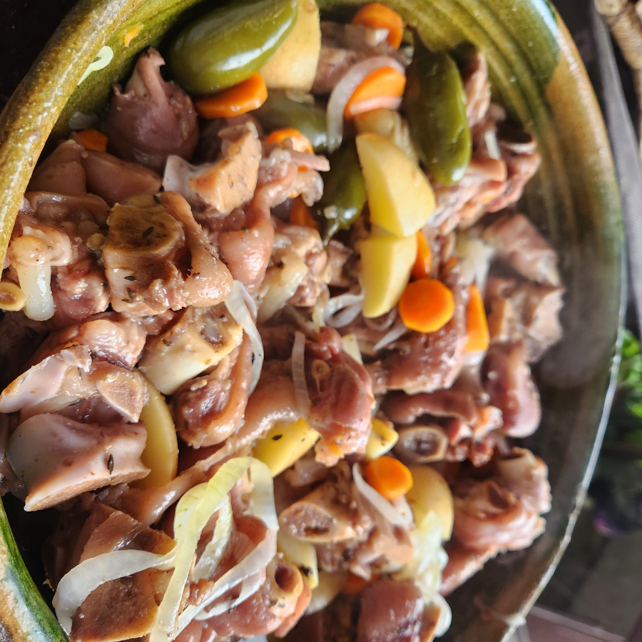 Patitas de puerco en vinagre acompañadas de papa y zanahorias con un toque de sabor picosito