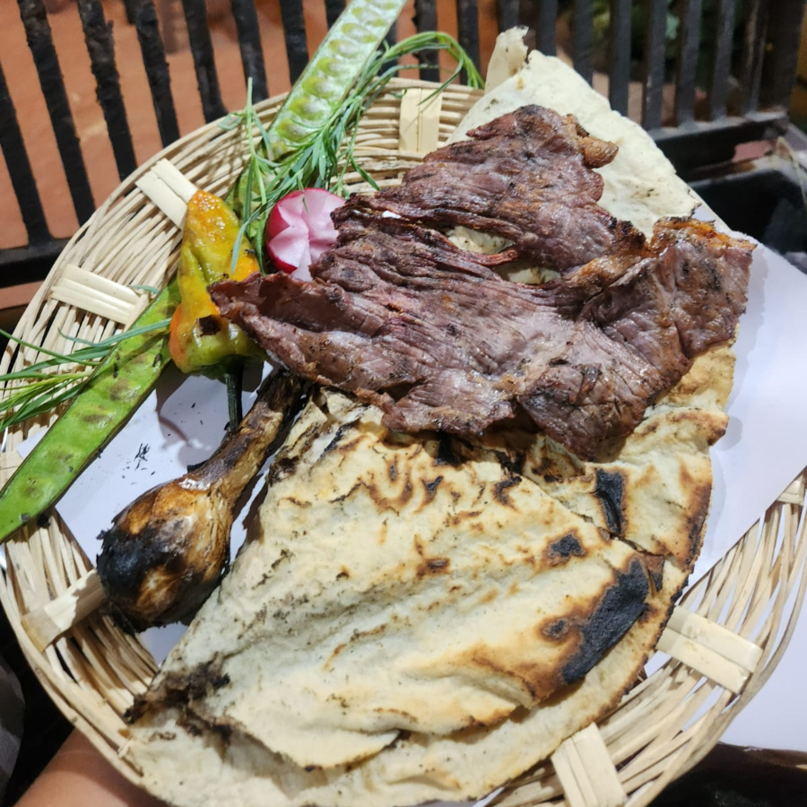 Tlayuda de tasajo al carbon (250 gr. aprox. de carne pesado en crudo) acompañada de chile de agua, guajes, chepiche, cebollita asada, limon, rabano, salsa y guacamole