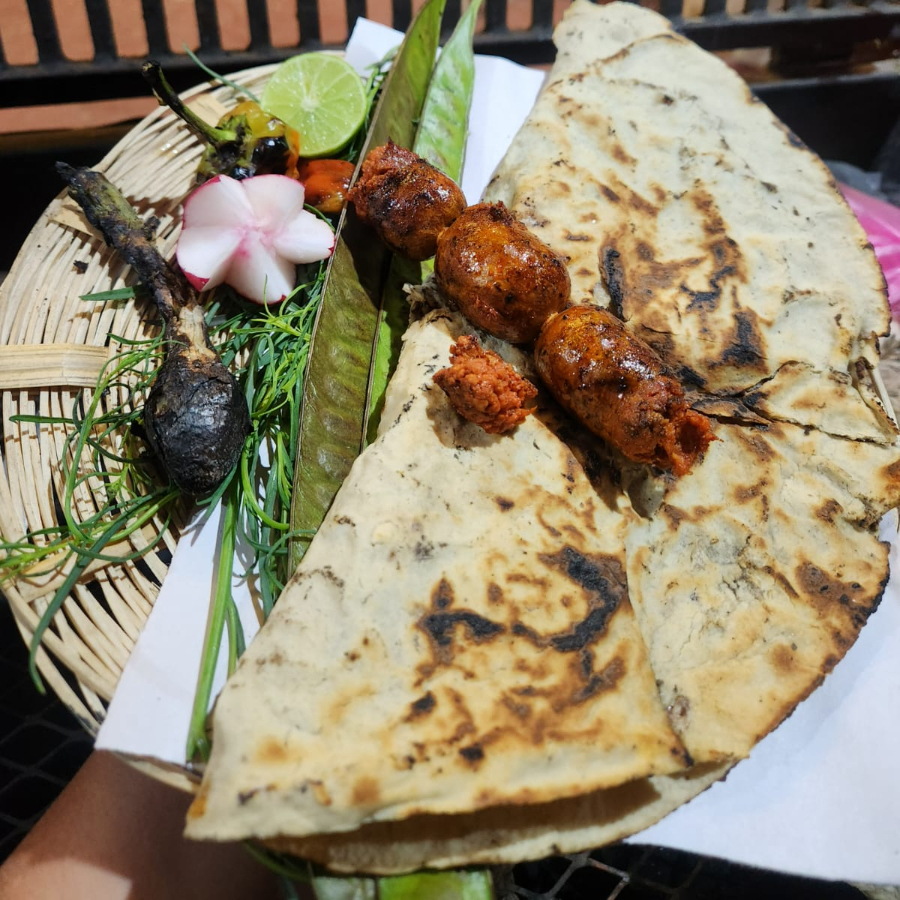 Tlayuda de chorizo al carbon (250 gr. aprox. de carne pesado en crudo) acompañada de chile de agua, guajes, chepiche, cebollita asada, limon, rabano, salsa y guacamole
