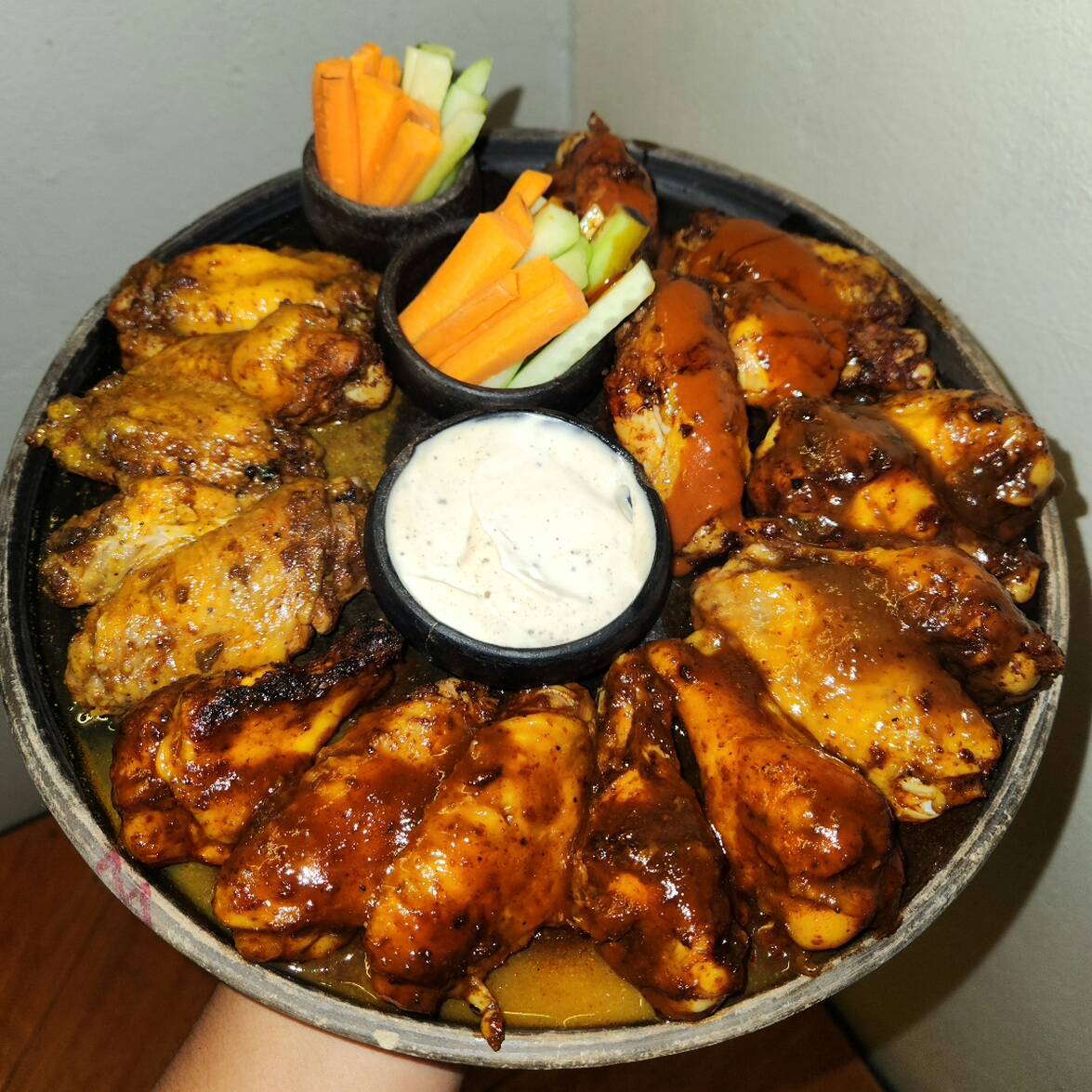Alitas asadas bañadas en salsas caseras de tu eleccion acompañdas de aderezo de la casa, pepino y zanahoria.