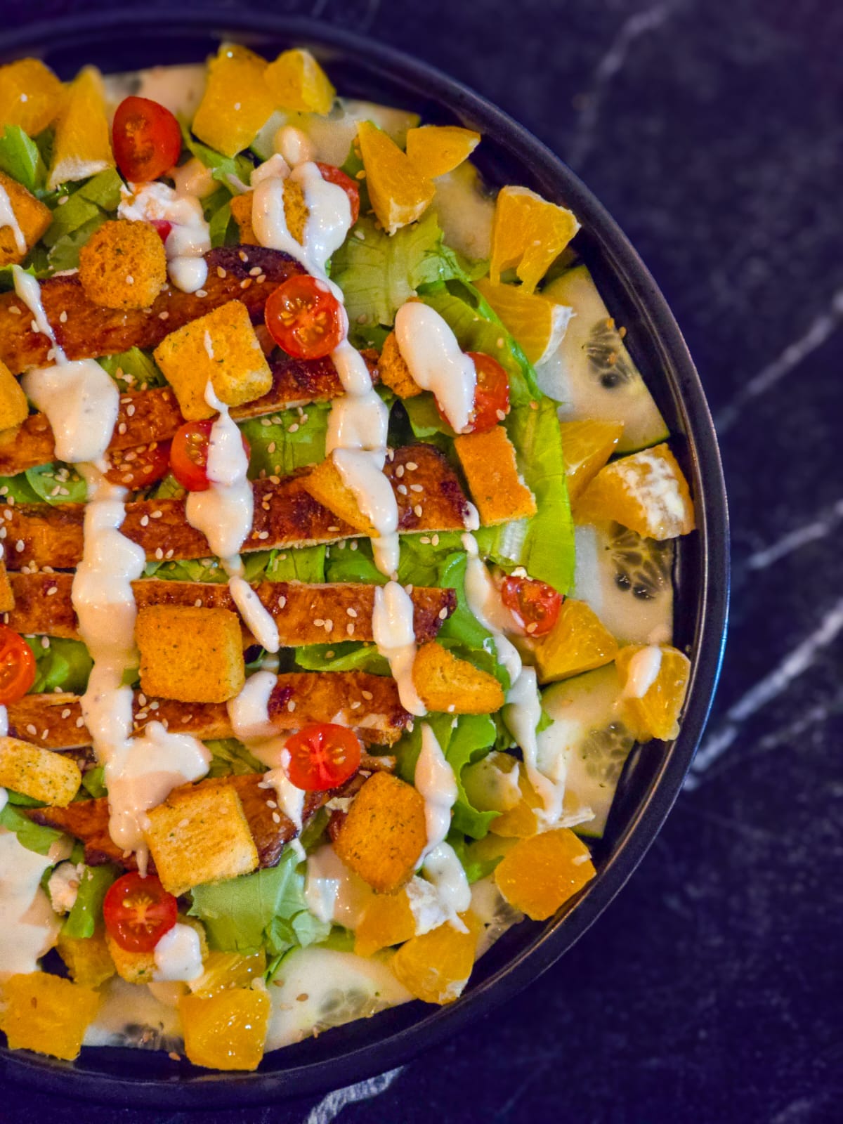 lechuga, tomate cherry, naranja, pepino, queso de cabra, ajonjolí, crutones y pechuga a la plancha fileteada
