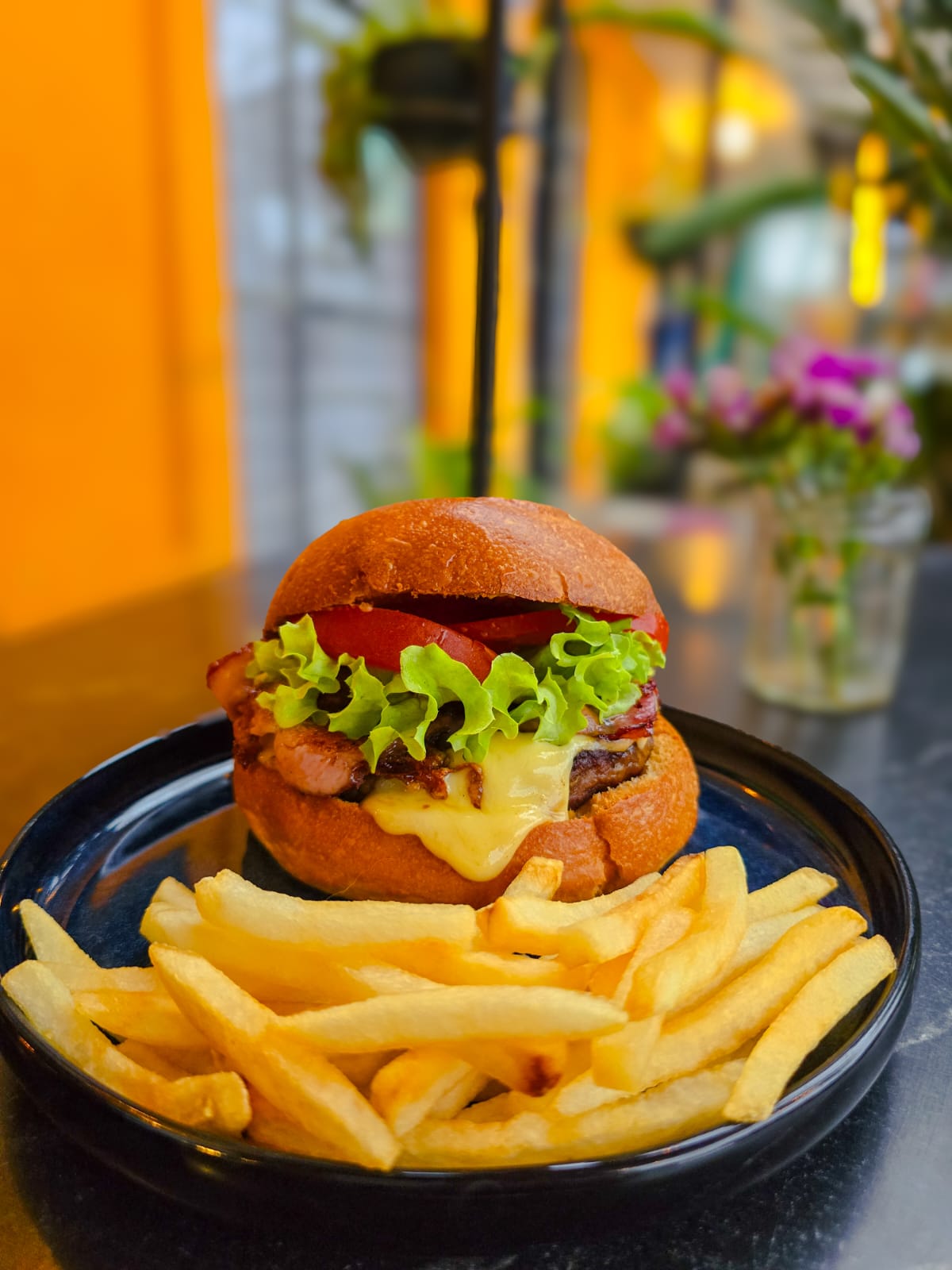 Carne de sirloin, tocino, queso Manchego, Salsa BBQ, lechuga, tomate, Cebolla morada, Aderezo de mayonesa con chipotle y acompañado de papas