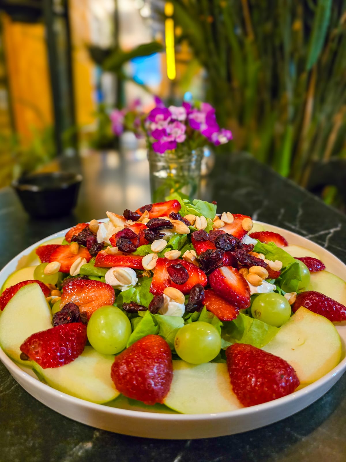 Lechuga, Manzana, Arándano deshidratado, cacahuate tostado, queso crema y fresas