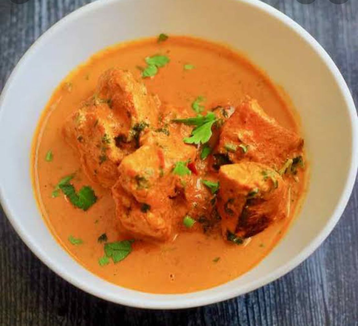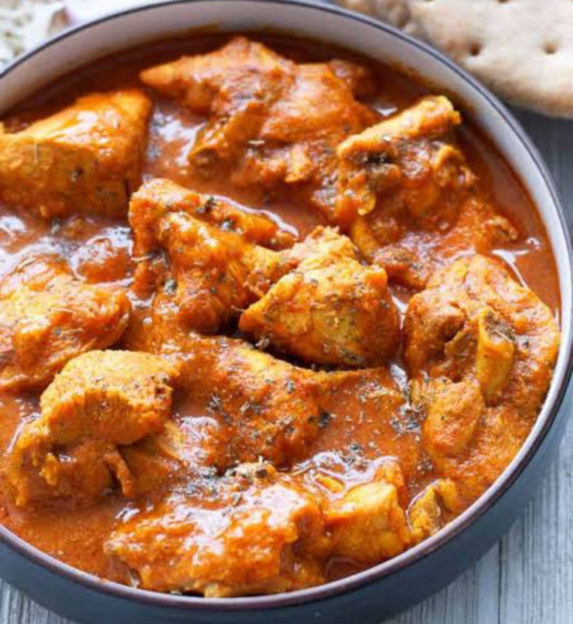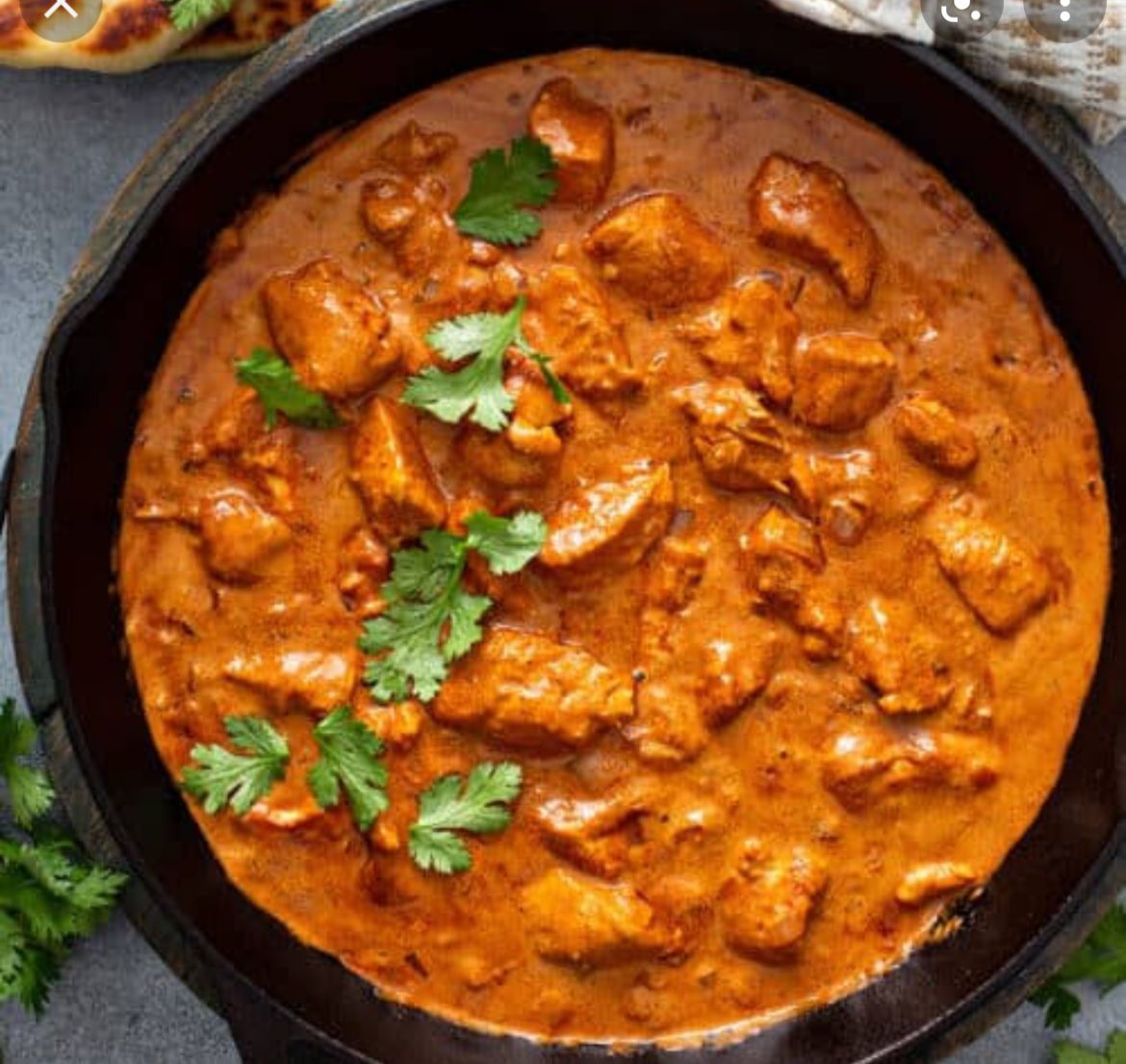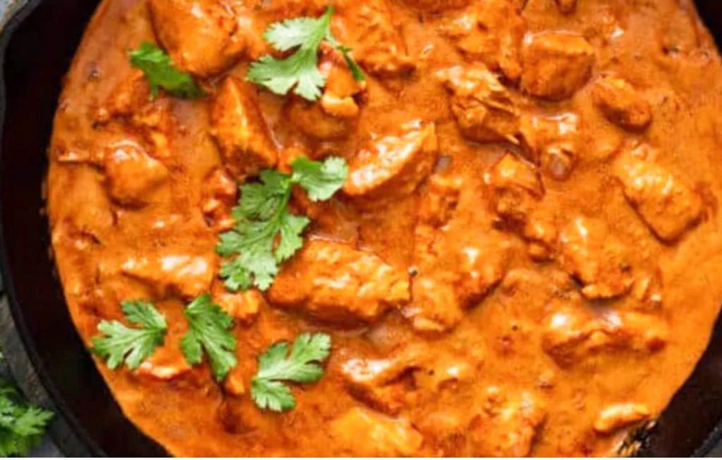 Pedacitos de pollo en salsa de mantequilla, tomate y especias. / Pieces of chicken in a butter and tomato..based curry with spices.