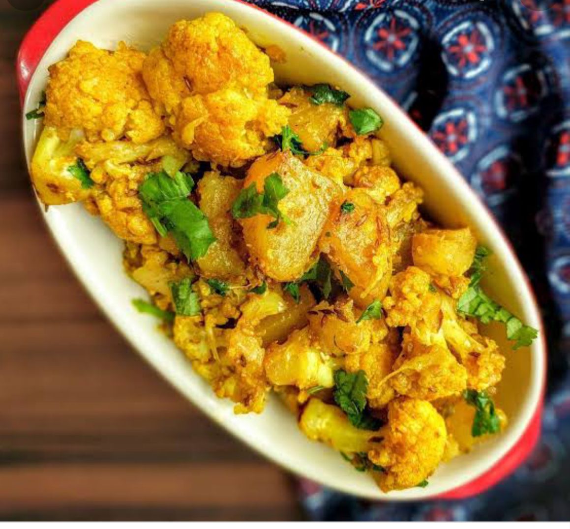 Mezcla de papas cocinadas con coliflor en una salsa especiada con comino.