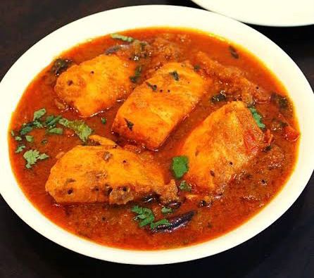 Trozos de gambas marinadas en luz auromática en salsa de curry y especias del norte de la india.