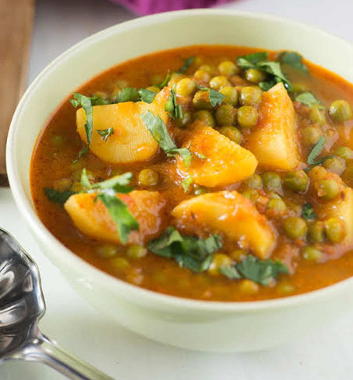 Patata y paz verde con cebolla y curry de tomate con especias del norte de la india.