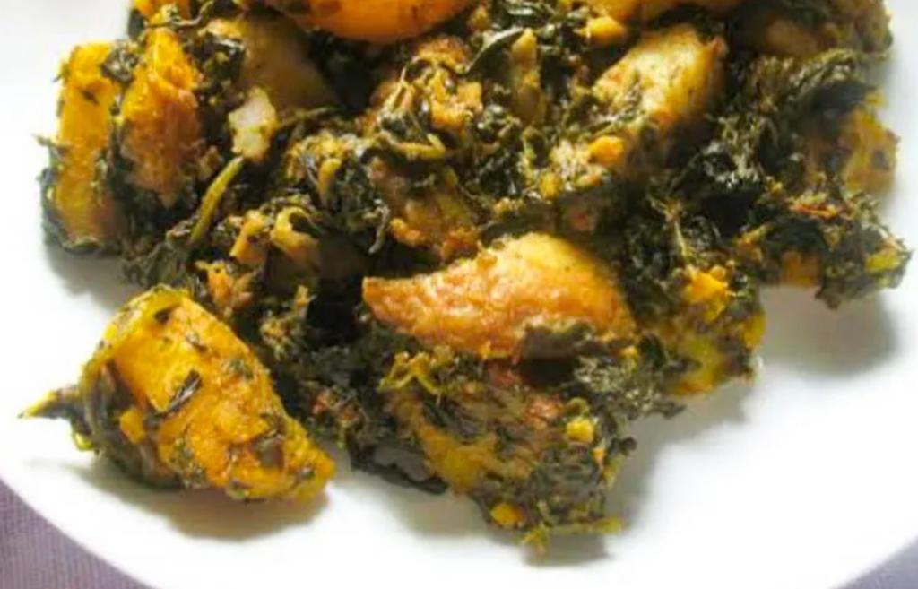 Pedacitos de papa especiados, bañados en una salsa de espinaca fresca.