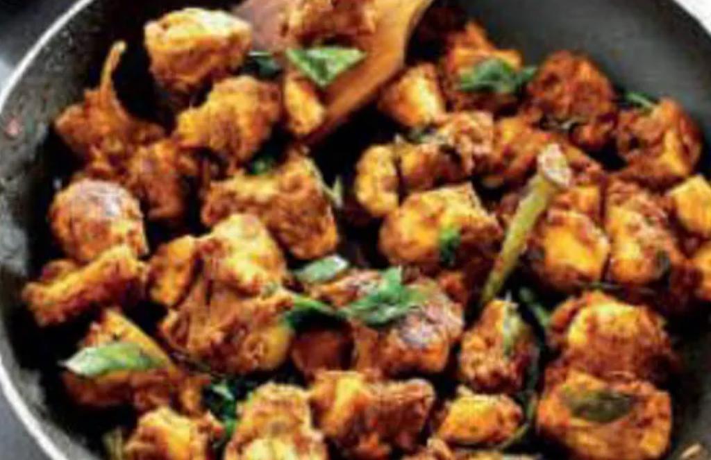 Mezcla fuerte de especes con semillas de mostaza y chile. / Pieces of meat cooked in a mix of spices with mustard seeds and chili.