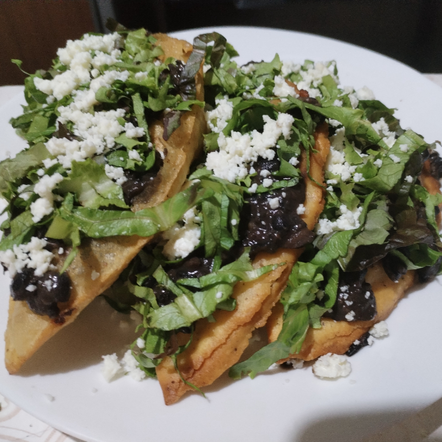 3 tostadas con frijol, lechuga, tasajo, aguacate