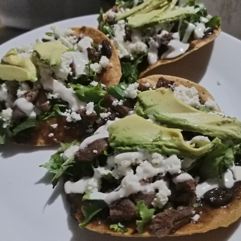 3 tostada con frijol lechuga carne arrachera, aguacate