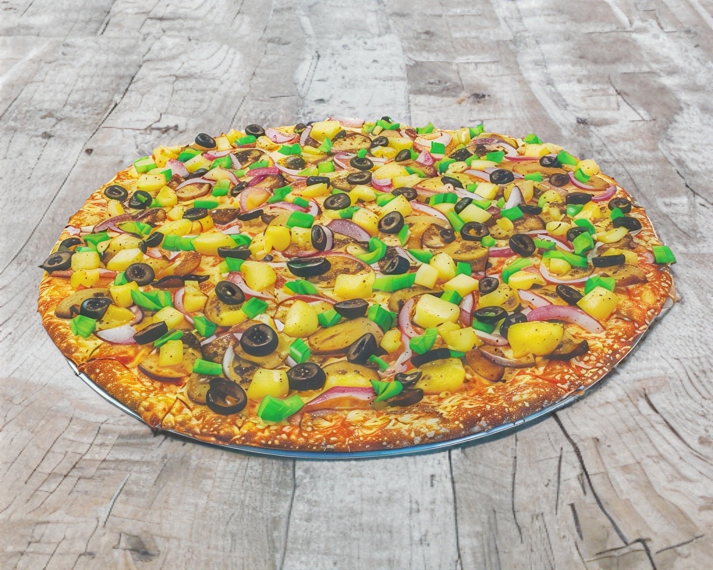 Champiñón, piña, pimiento morrón, aceituna, cebolla morada.